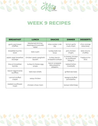 The document provides a week's worth of recipes organized by meal (breakfast, lunch, snacks, dinner, desserts). It includes recipes such as apple sage breakfast sausage, garlic parmesan chaffles, blackened shrimp and asparagus salad, loaded cauliflower mash, chicken pesto spaghetti squash, and turkey and cheese egg wraps. Nutritional information is provided for each recipe, including calories, fat, protein, and carbohydrates. Ingredients and preparation instructions are listed for making the various dishes.