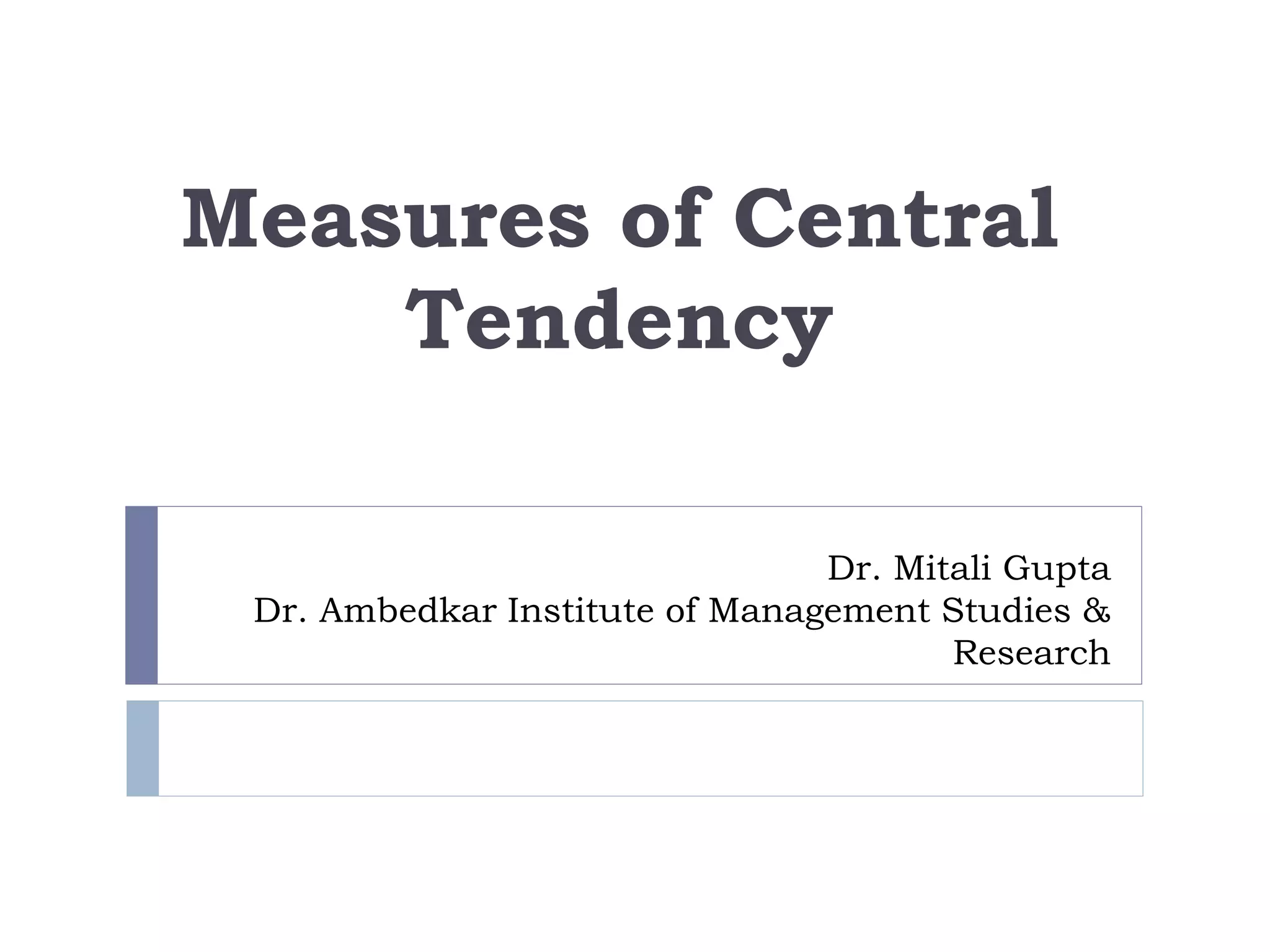 This document discusses measures of central tendency including the mean, median, and mode. It defines each measure and provides examples of calculating them using individual, discrete, and continuous data series. The mean is the average value obtained by dividing the sum of all values by the total number of values. The median is the middle value when data is arranged in order. The mode is the value that occurs most frequently. Formulas and examples are given for calculating each measure using different types of data sets. Merits and demerits of each measure are also outlined.