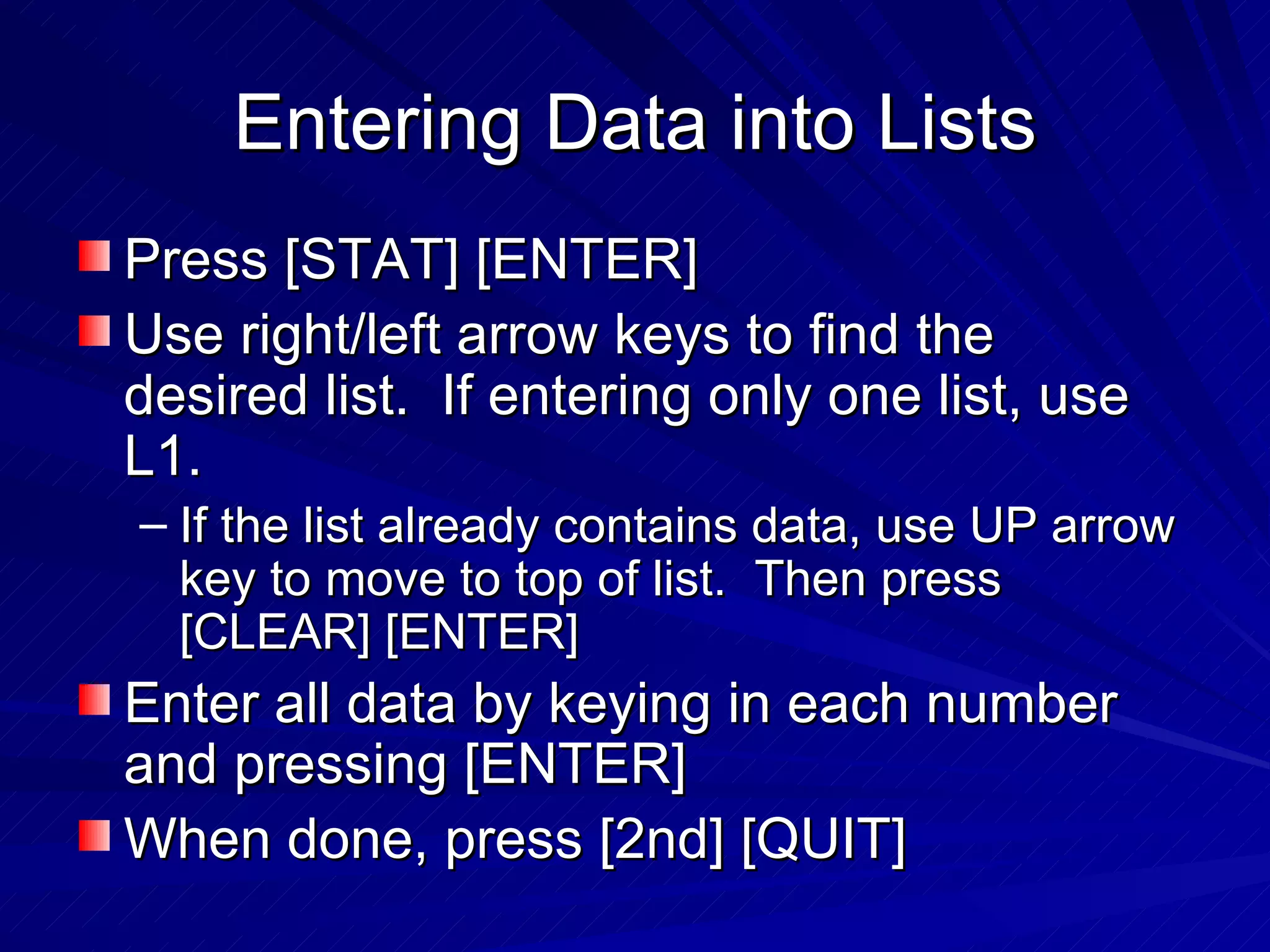 This document provides instructions for entering and analyzing sample data in lists on a graphing calculator. It describes how to clear all lists, enter data into lists, sort the data, and find the mean, median, mode, minimum and maximum values, and range of the data in a list. Calculations and results are provided for an example data set containing 11 numbers.