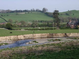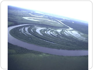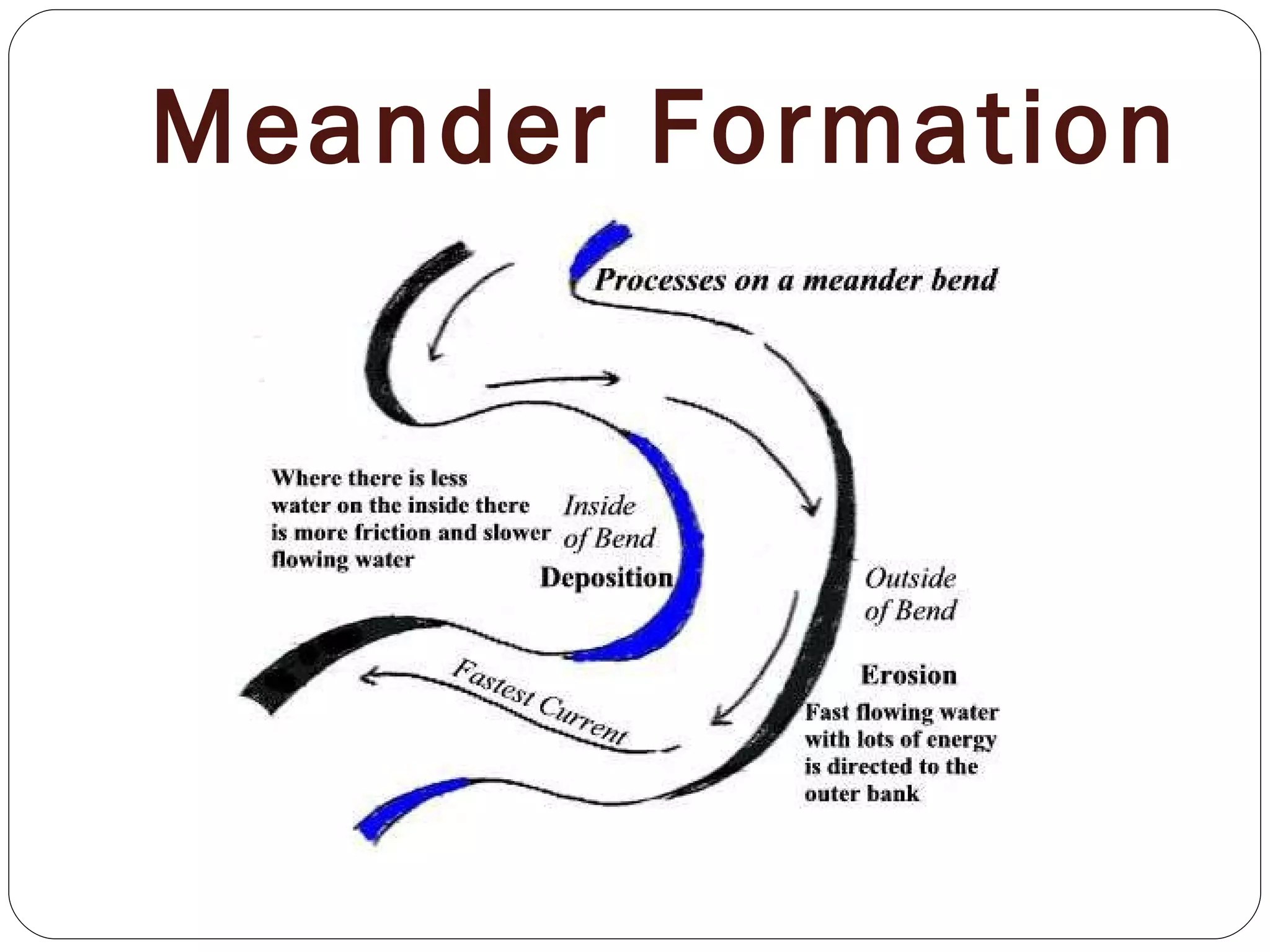 Meanders form through the process of helicoidal flow. At bends in the river, centripetal force throws water towards the outer bank, eroding and undercutting it. Slower flow on the inside of bends leads to deposition and the formation of point bars. Helicoidal flow causes eroded material to be deposited downstream in the next meander loop, furthering the meandering shape over time as the river seeks the most efficient path.