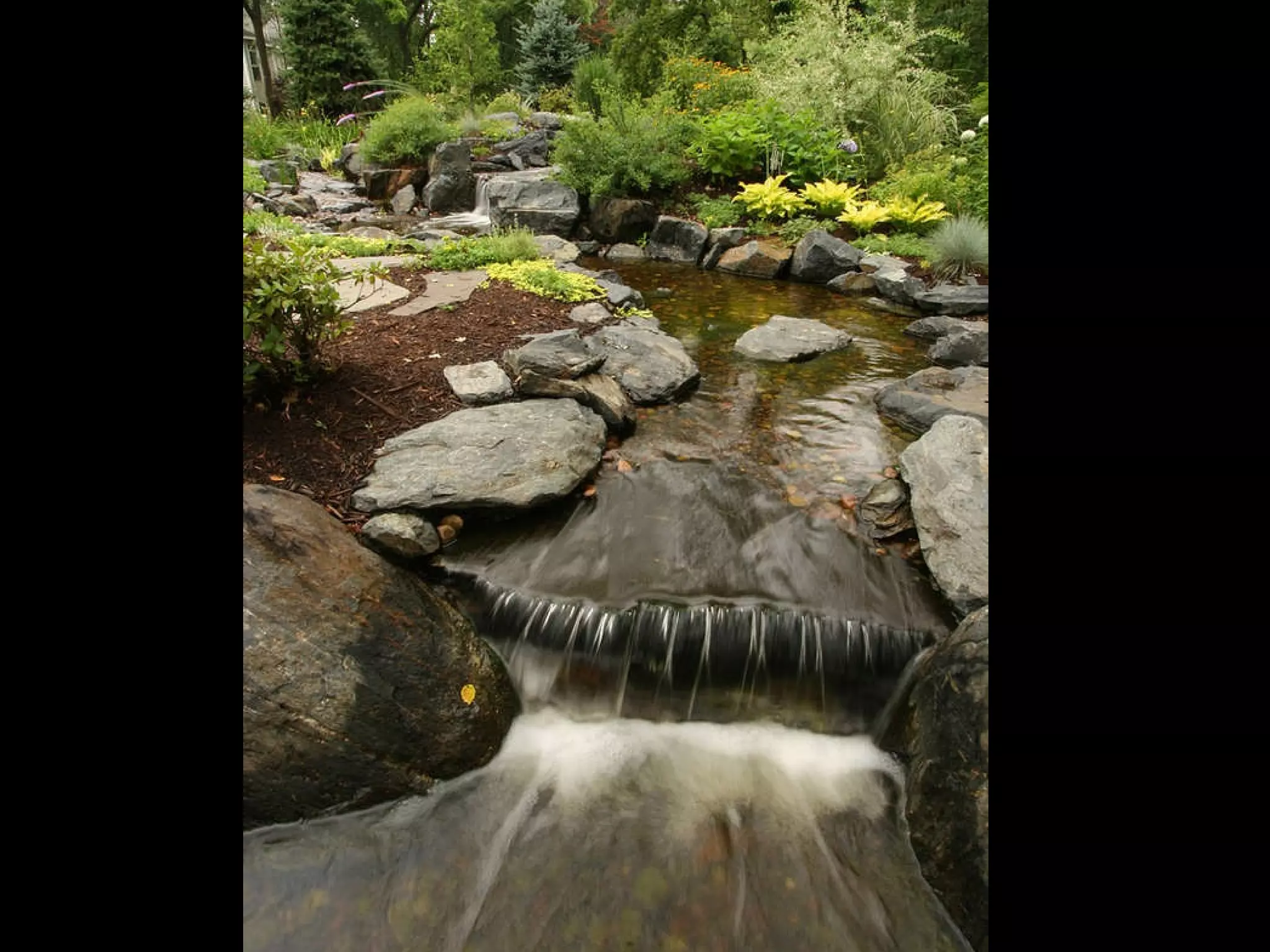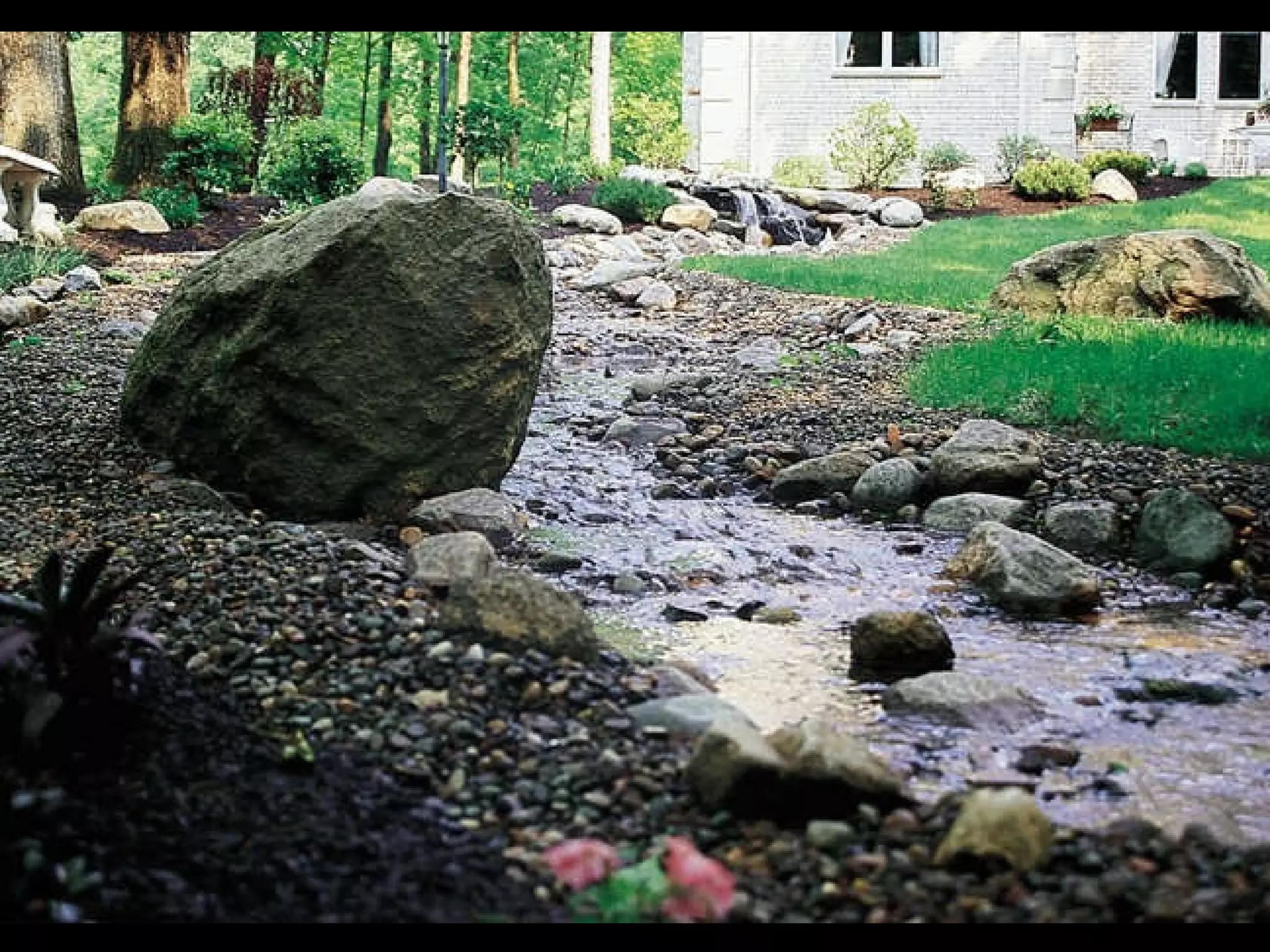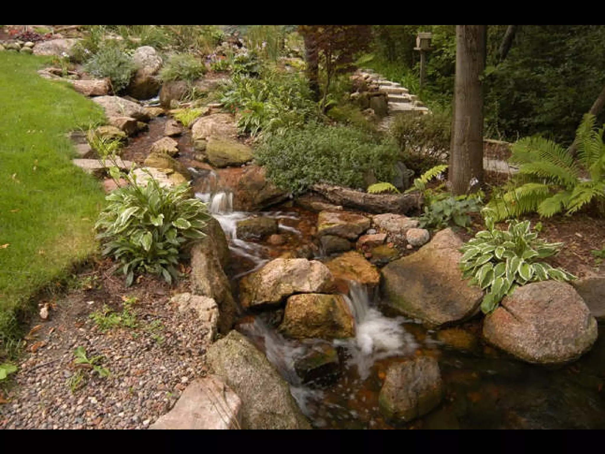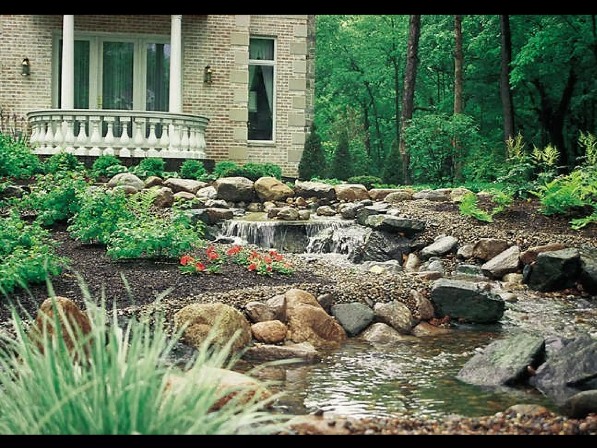 The document provides information about Aquascape, a company located at 901 Aqualand Way, St. Charles, IL 60174. It features content related to meandering streams in landscaping. The primary focus is on products and services offered by Aquascape.