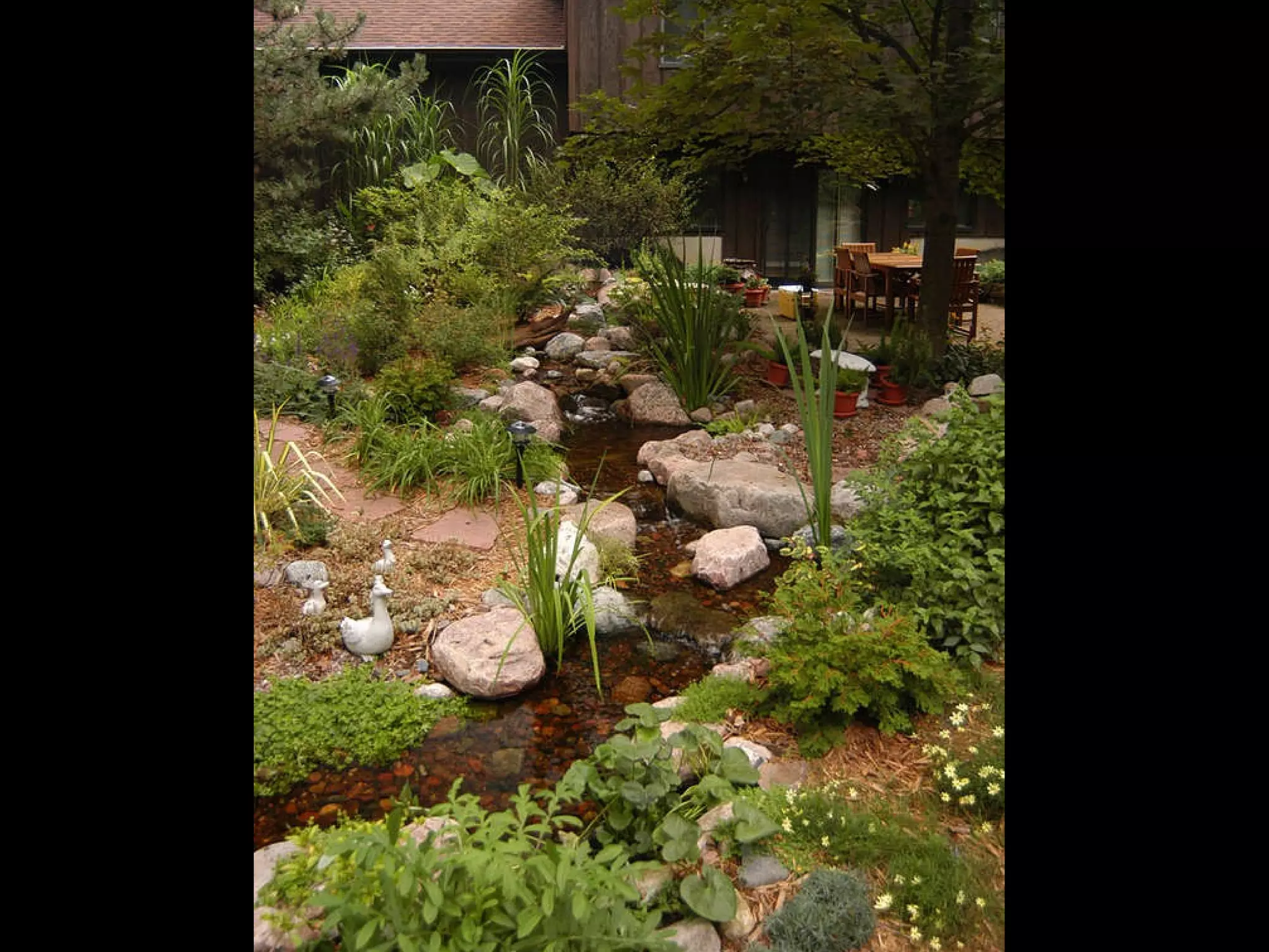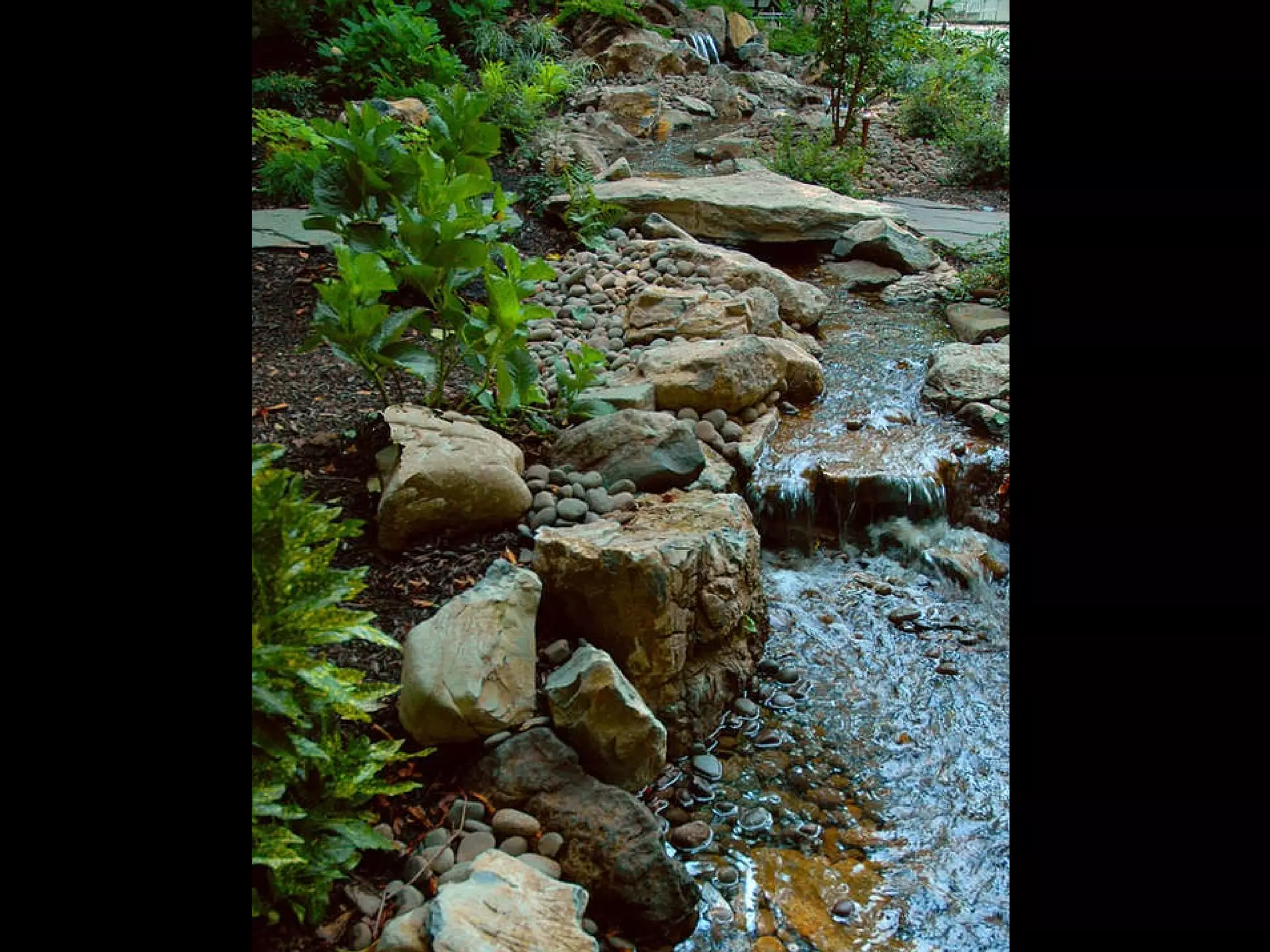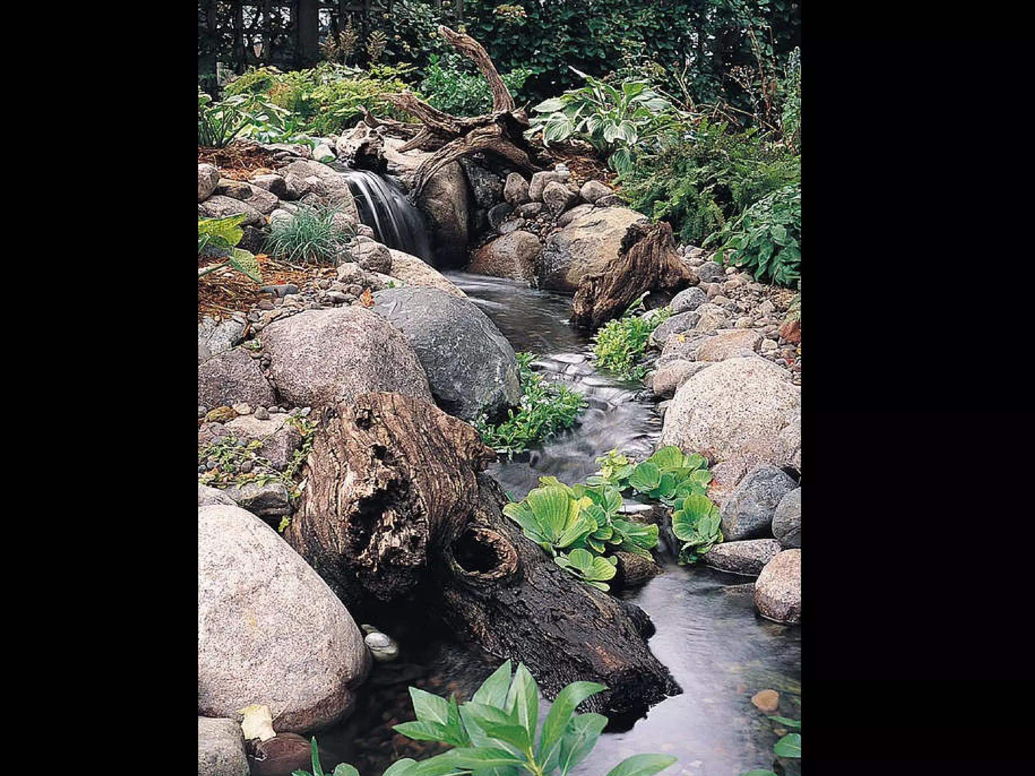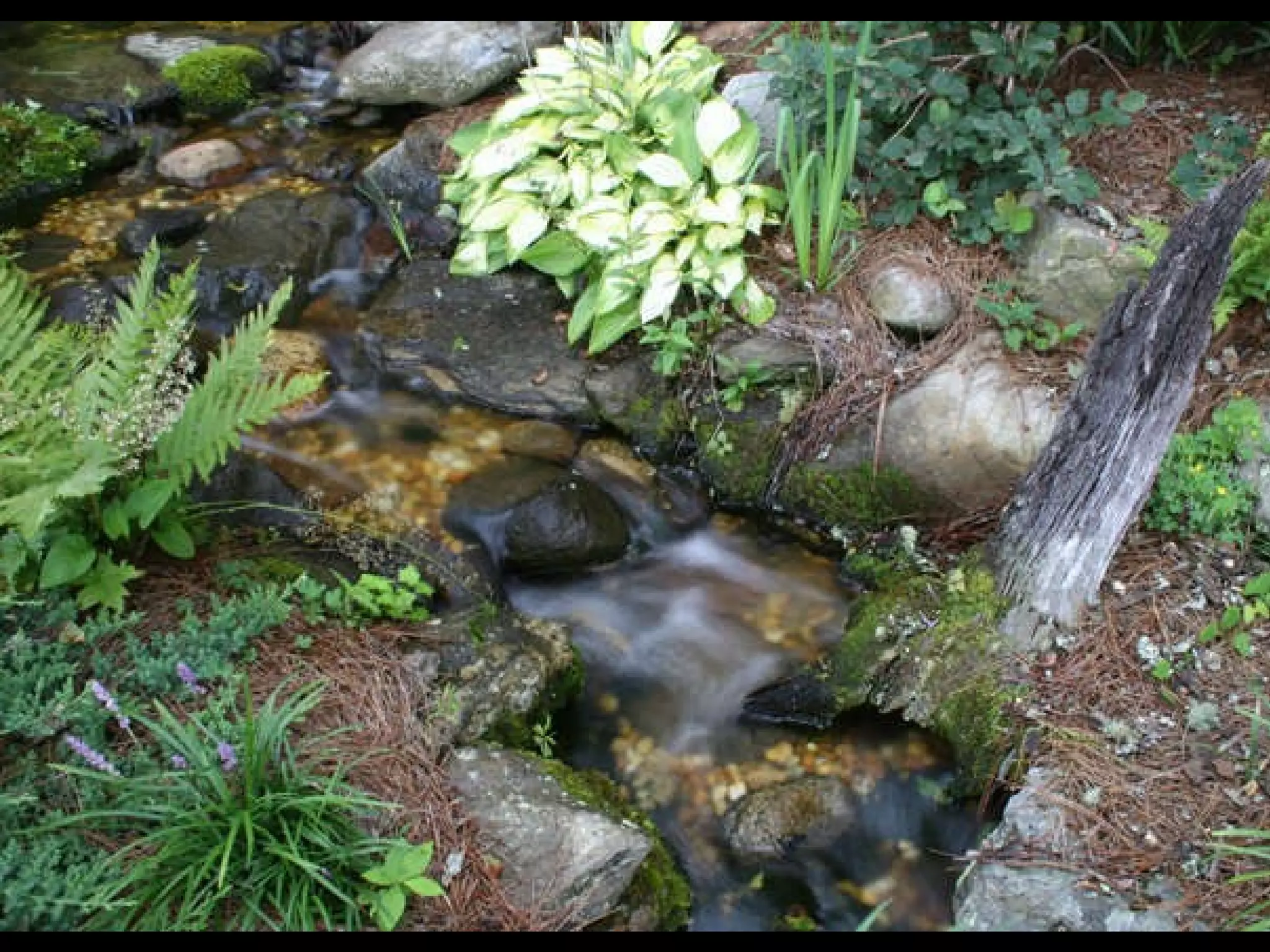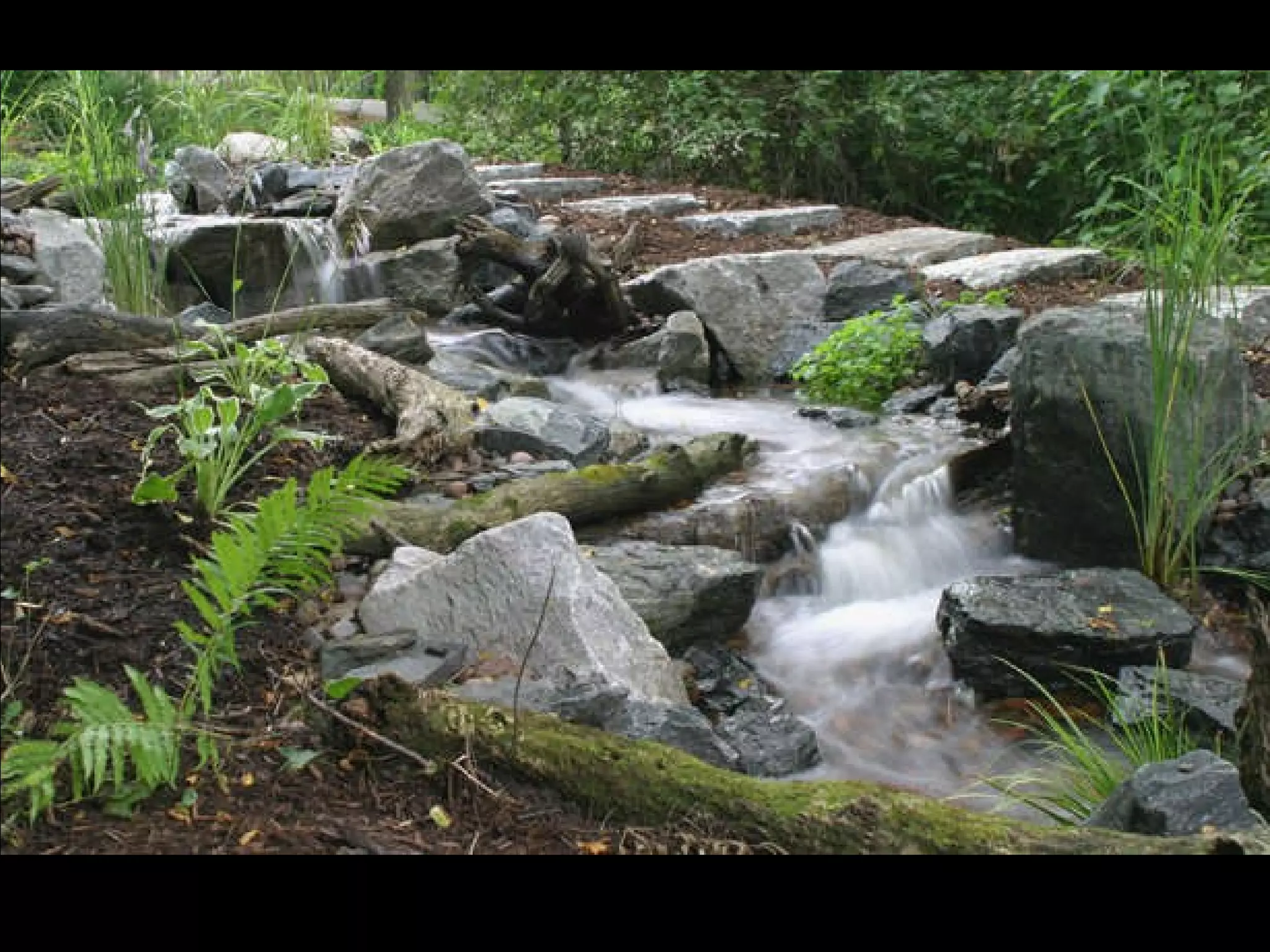 The document provides information about Aquascape, a company located at 901 Aqualand Way, St. Charles, IL 60174. It features content related to meandering streams in landscaping. The primary focus is on products and services offered by Aquascape.
