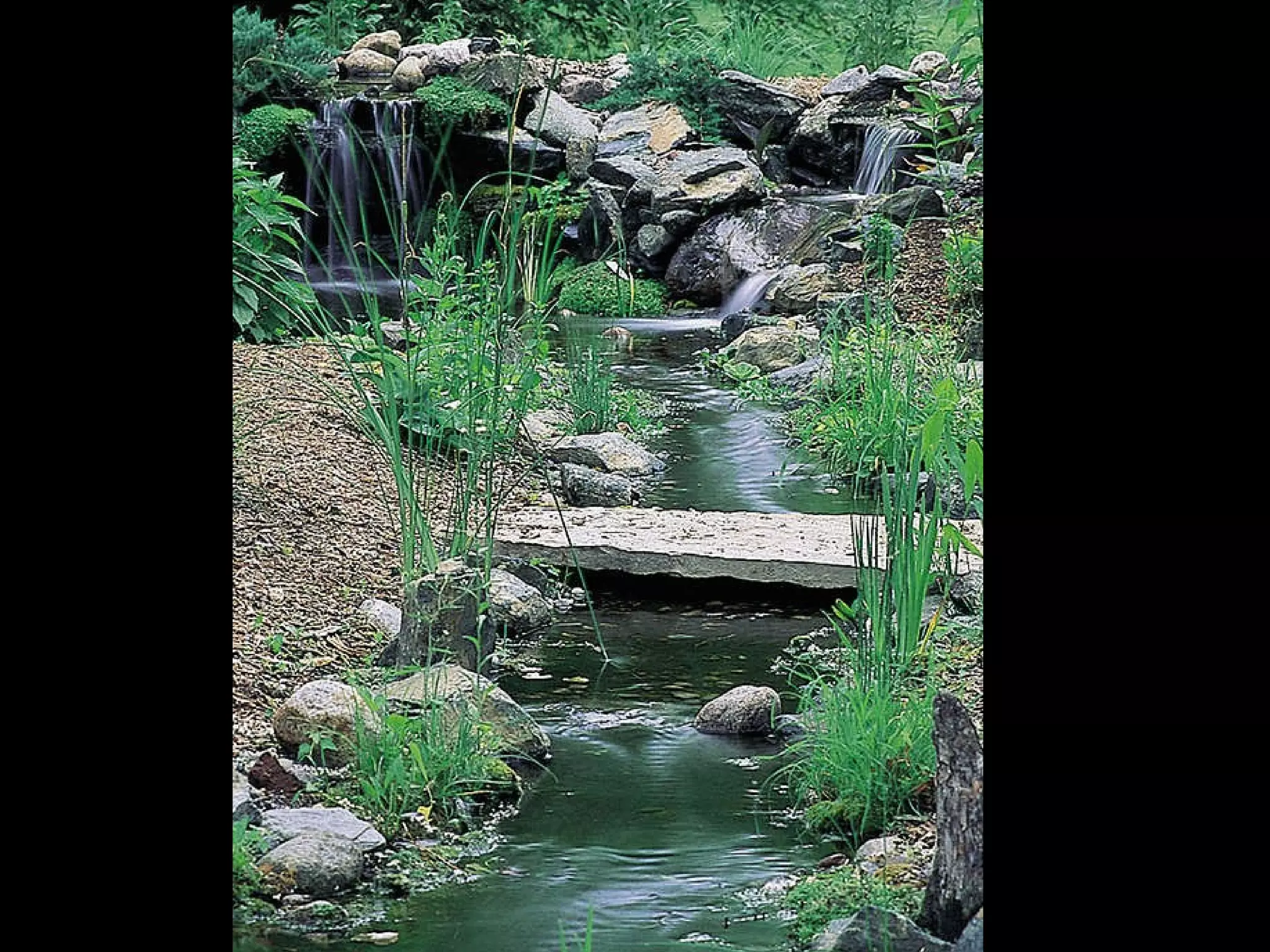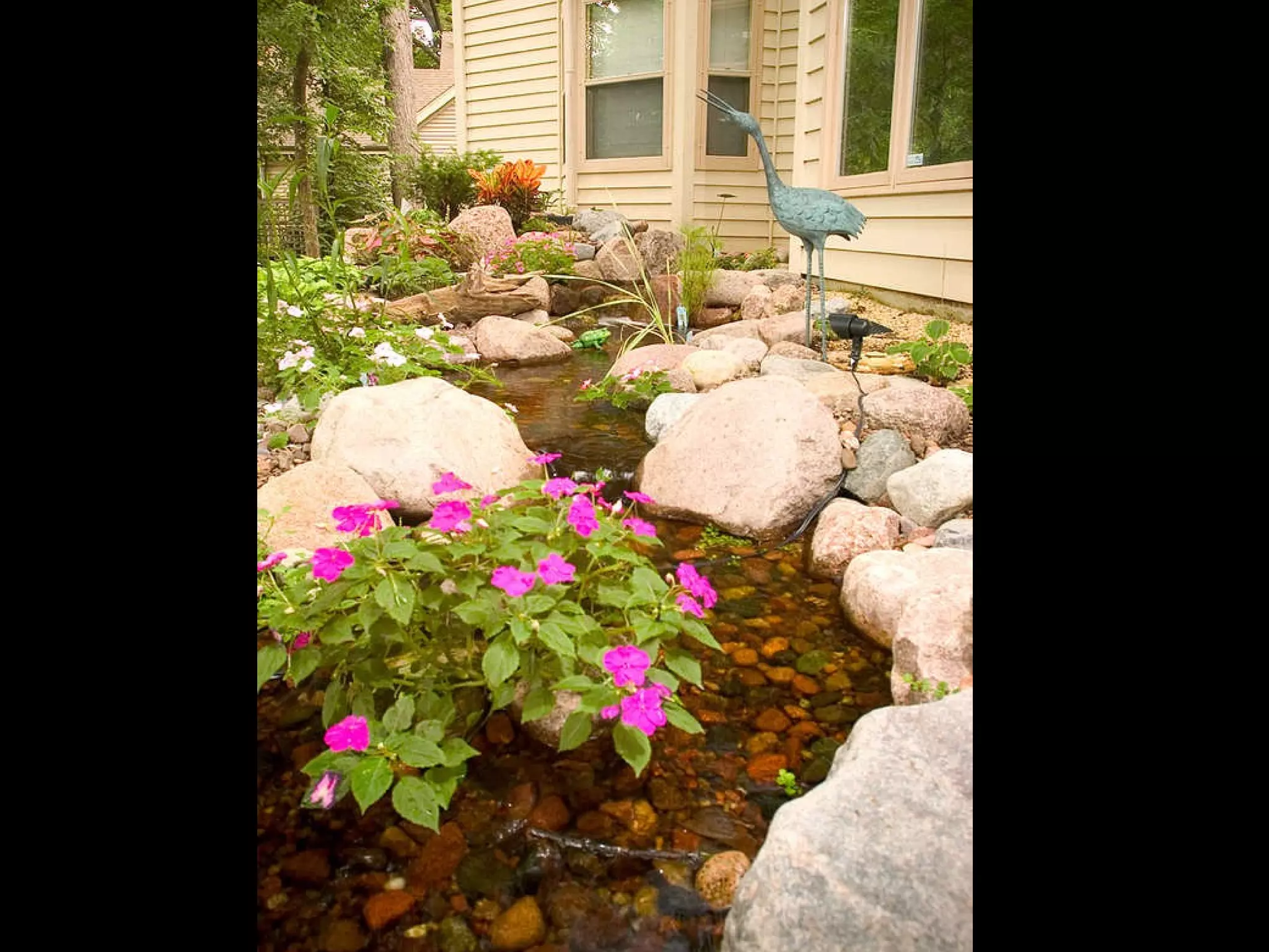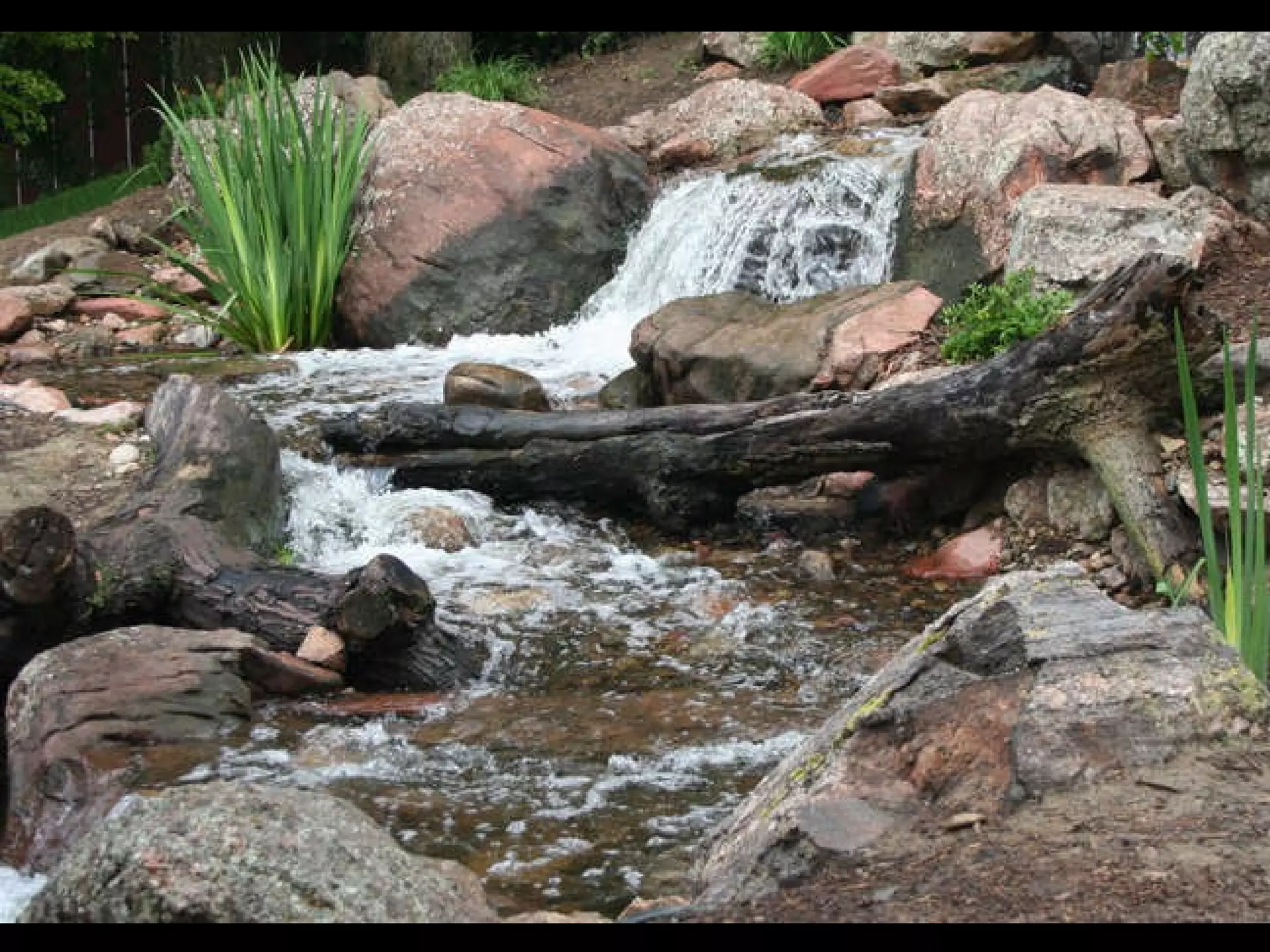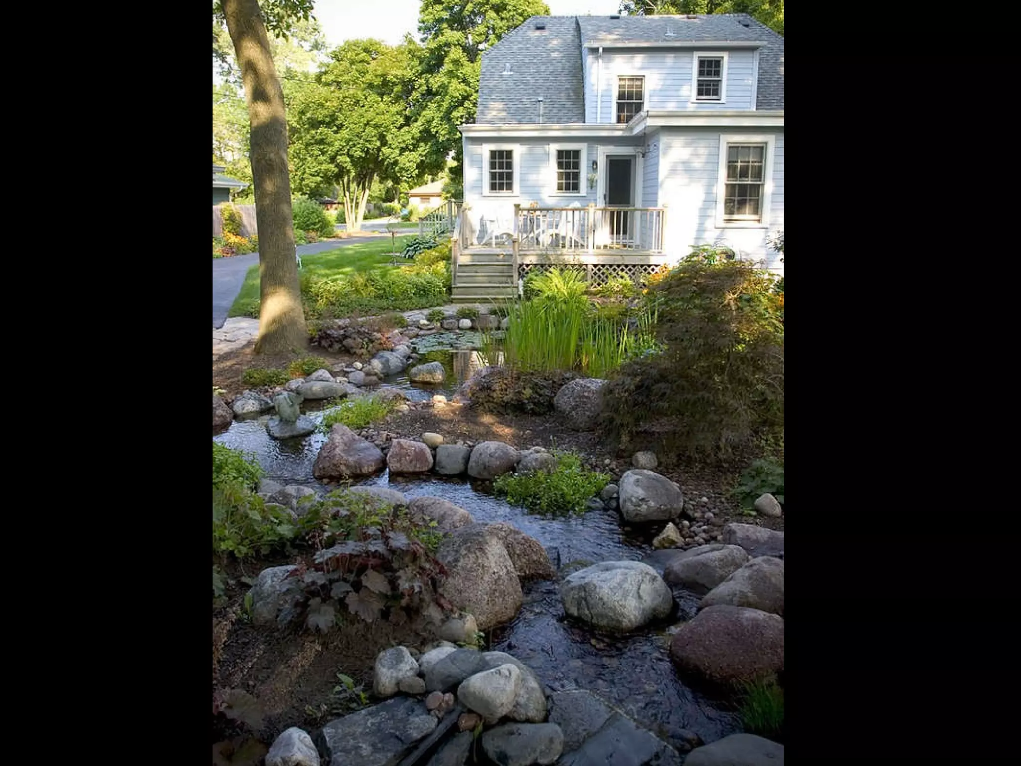 The document provides information about Aquascape, a company located at 901 Aqualand Way, St. Charles, IL 60174. It features content related to meandering streams in landscaping. The primary focus is on products and services offered by Aquascape.