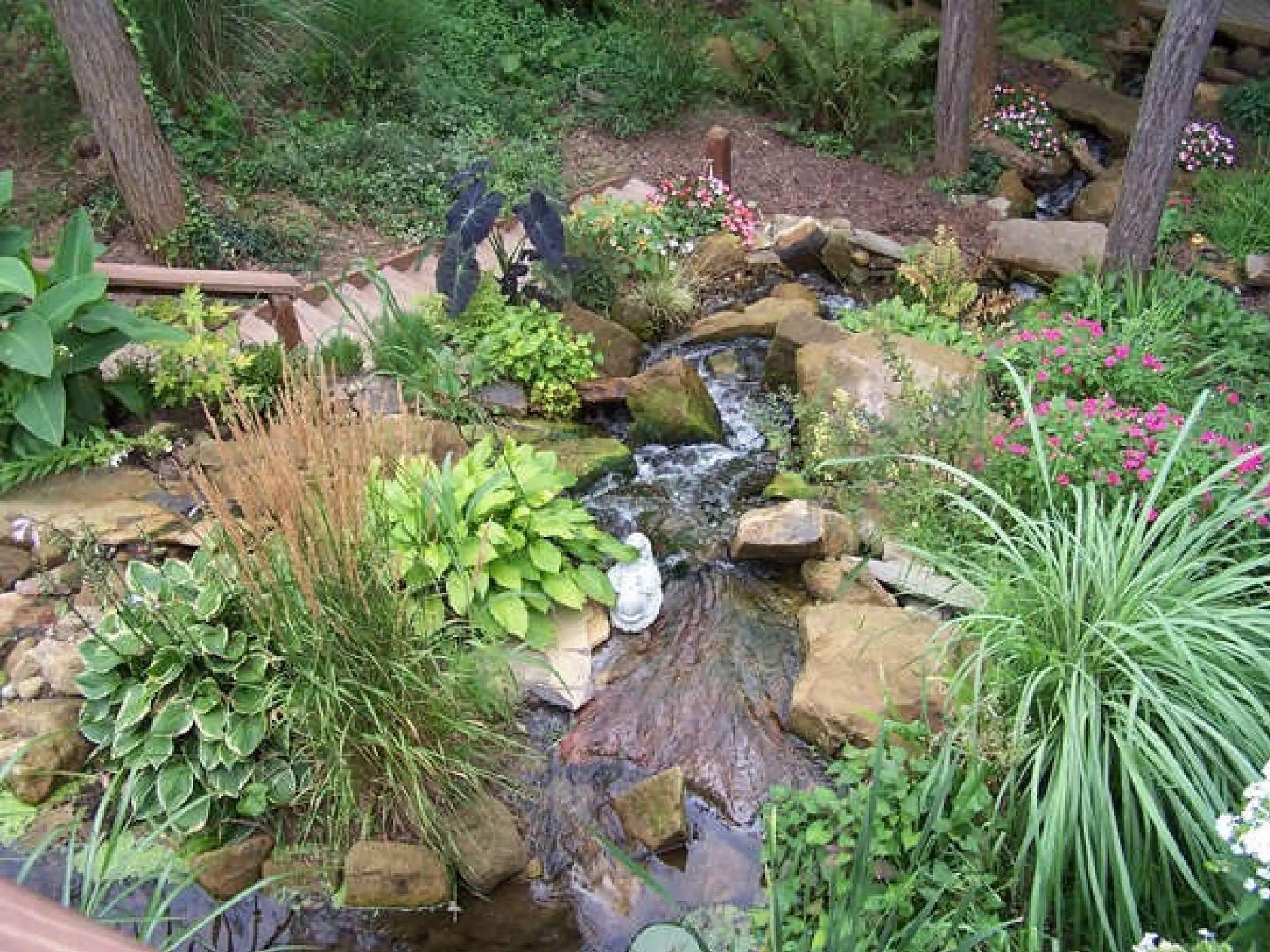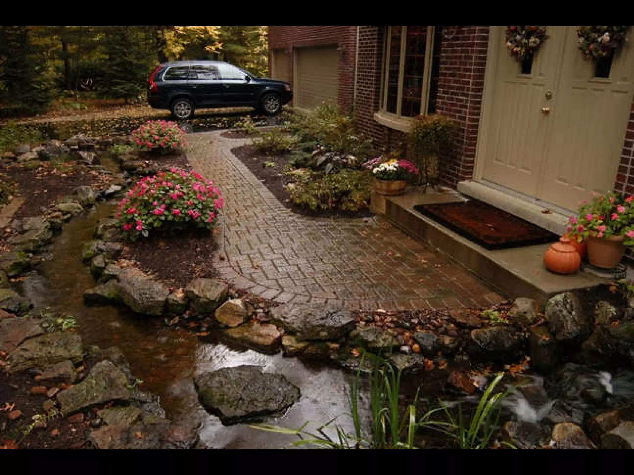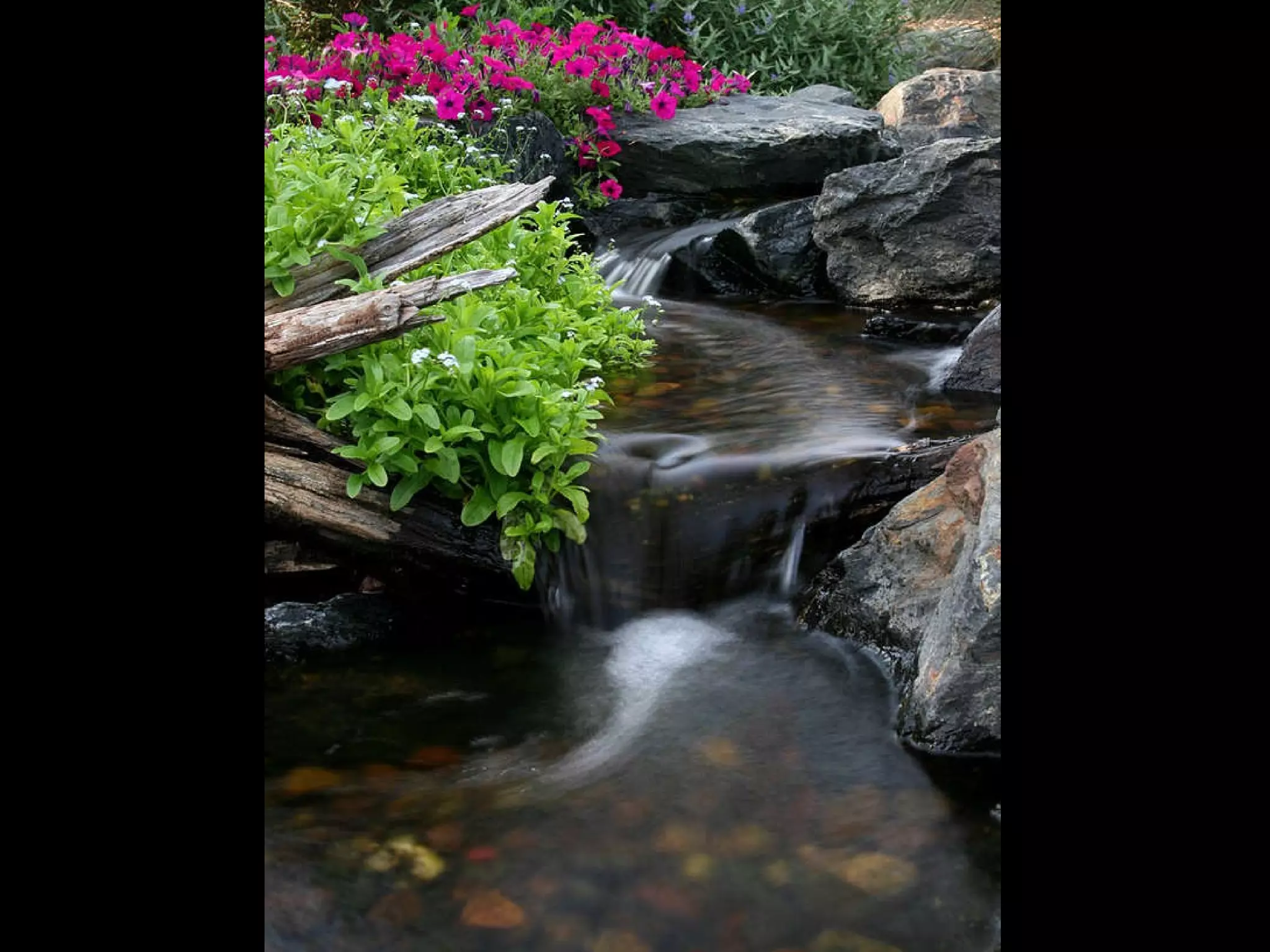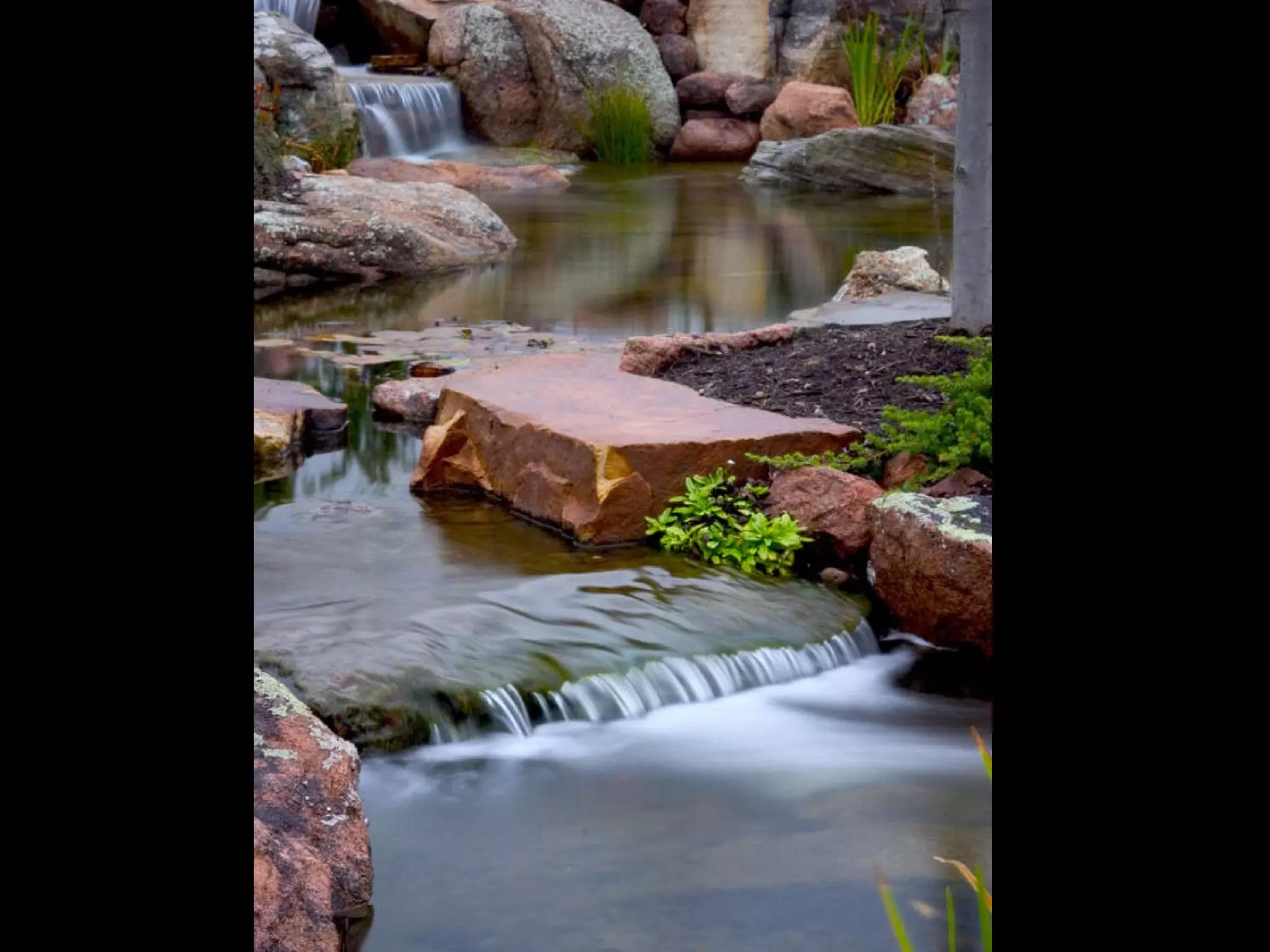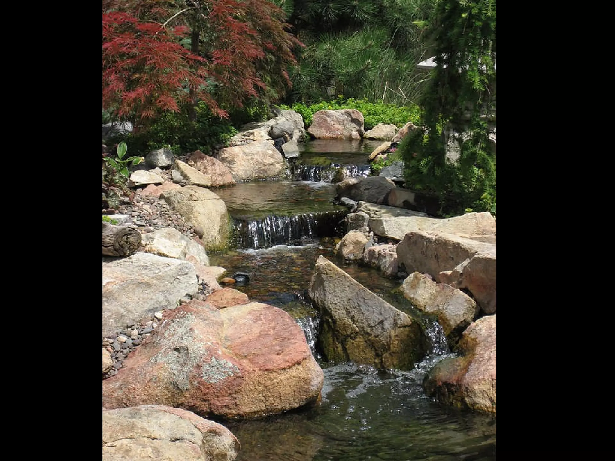 The document provides information about Aquascape, a company located at 901 Aqualand Way, St. Charles, IL 60174. It features content related to meandering streams in landscaping. The primary focus is on products and services offered by Aquascape.