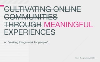 The document discusses cultivating meaningful experiences through online communities. It emphasizes that user experience design should focus not just on functionality, usability, and reliability, but also on creating experiences that are pleasurable, memorable, convenient, and meaningful to users. To do this, designers must prioritize aesthetics, design for flow states, leverage game mechanics and learning theory, and create experiences with personality that empower users and elicit desire. The goal is to build products that bring joy to people's lives rather than just functioning as programmed.