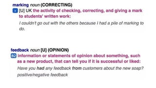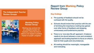 The document discusses effective marking and feedback strategies in education, emphasizing the importance of providing constructive feedback that positively influences student learning. It highlights research findings on feedback impacts, outlines the role of teachers in marking, and suggests alternatives to traditional marking practices to avoid wasting time. Additionally, it includes educational acronyms and actionable steps for improving feedback mechanisms, specifically focusing on engaging students in the review and response process.
