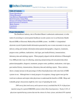 The document discusses the transition of the healthcare industry to electronic health records (EHR) systems, emphasizing the importance of meaningful use for improving patient care and clinical research. It highlights the adoption rates of EHR systems among physicians and hospitals, the challenges faced in fully implementing functional systems, and outlines a project undertaken by Rush University to evaluate and improve clinical metrics following EHR implementation. Key findings indicate improvements in medication reconciliation and documentation but show no significant change in patient satisfaction with discharge instructions.