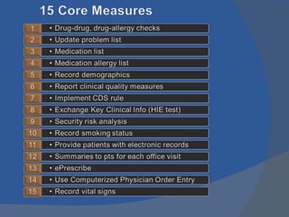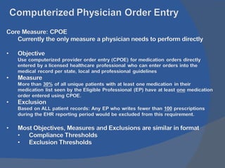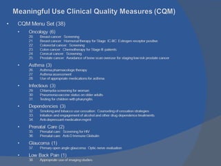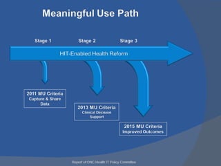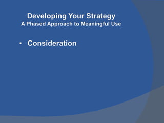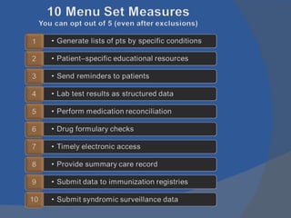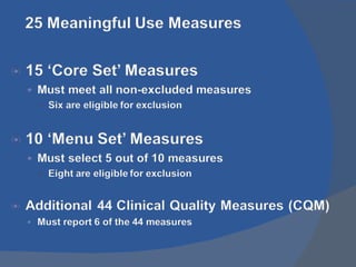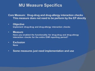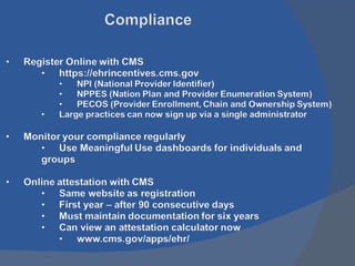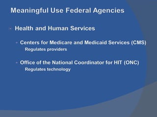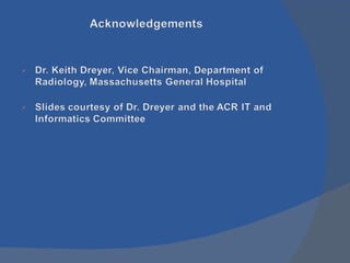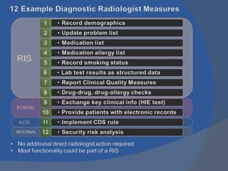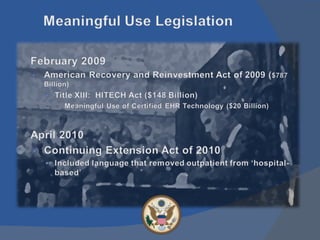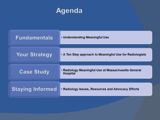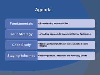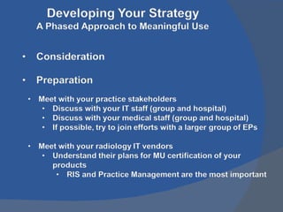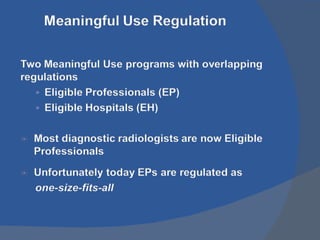 The document discusses the complexities around the Meaningful Use (MU) process in radiology, highlighting the challenges that radiologists face in integrating electronic health record (EHR) systems. It outlines the financial implications and certification criteria for participation, noting that radiologists may not use EHRs in the same way as other eligible professionals, potentially impacting their incentive eligibility. Additionally, it references contributions from various speakers and emphasizes the need for consistent policies regarding patient interactions in the context of MU measures.