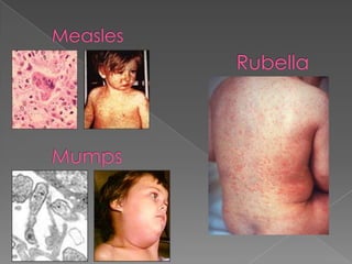 This document discusses measles, mumps, and rubella. Measles causes a rash and is spread through respiratory droplets. It can lead to complications like pneumonia or encephalitis. Mumps causes swelling of the salivary glands and is common in children ages 2-12. It spreads through respiratory droplets. Rubella, also called German measles, causes a rash and inflammation and is spread through the air or close contact. All three diseases can be prevented through routine immunization with the MMR vaccine.