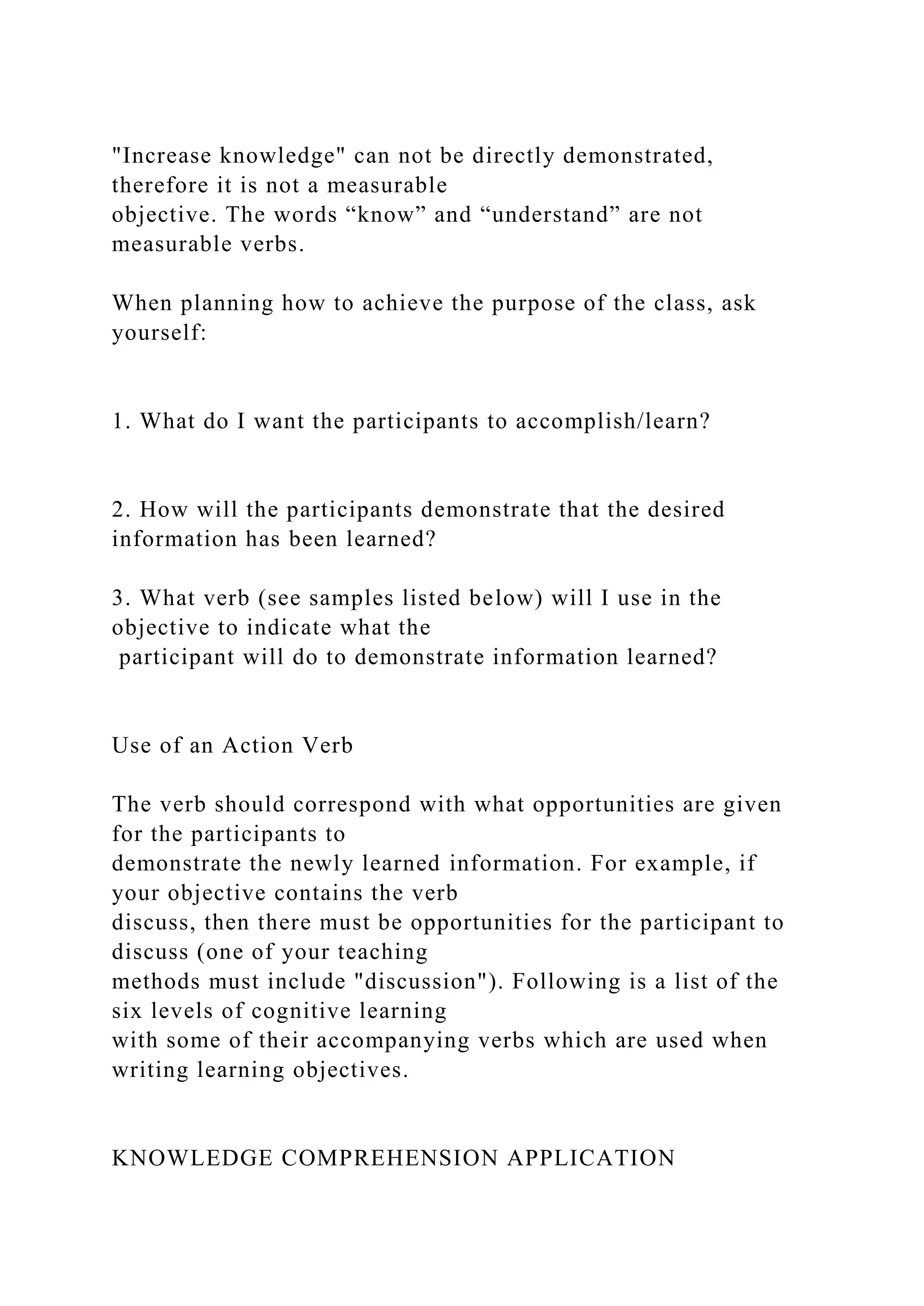 The document provides guidelines for creating measurable behavioral learning objectives essential for educational activities, emphasizing the use of active verbs to specify expected behavior changes. It distinguishes between measurable and unmeasurable objectives and outlines the importance of aligning instructional methods with the chosen action verbs. Additionally, it includes various levels of cognitive learning and corresponding verbs for writing objectives related to psychomotor and affective categories.