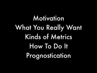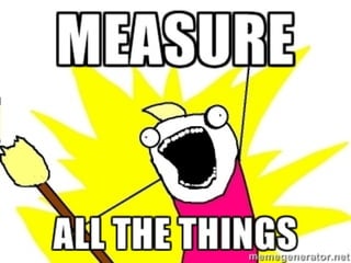 The document discusses the importance of metrics and measurement in business. It notes that as data generation increases exponentially, metadata and time-series data provide valuable insights. Different types of metrics are described like gauges, counters, timers and histograms. Methods for collecting metrics are outlined including instrumenting software and systems. The key is to measure the right things that matter to the business and help inform decisions.