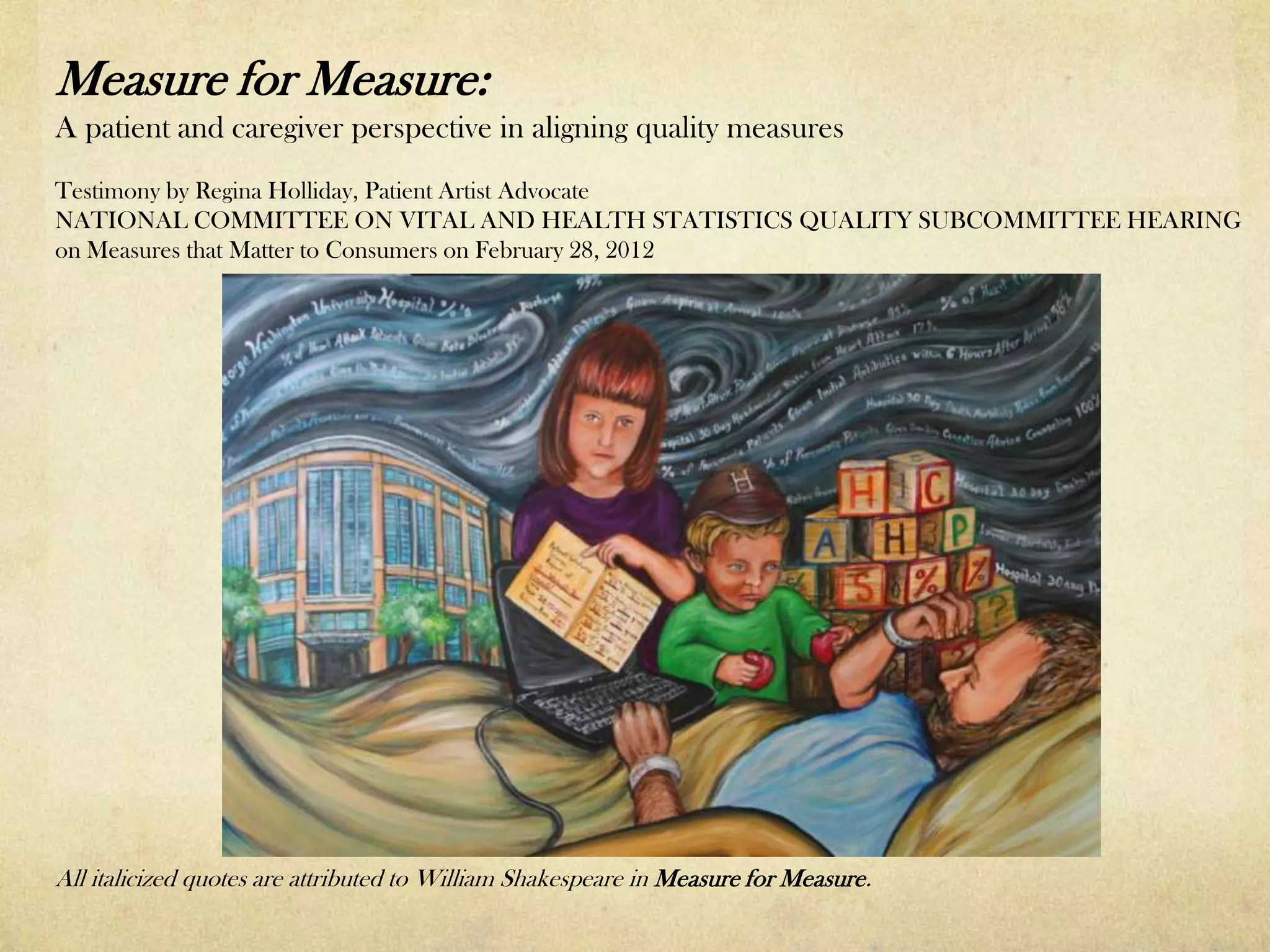 Regina Holliday's testimony emphasizes the need for patient involvement in healthcare quality measures, advocating for comprehensive access to medical records and active participation in data collection. The document critiques existing measurement systems that often overlook personal experiences and calls for inclusive practices that consider patients' perspectives, particularly those with disabilities and rare diseases. It stresses the importance of transparency in healthcare metrics and the necessity of continuous re-evaluation to ensure they align with quality care standards.