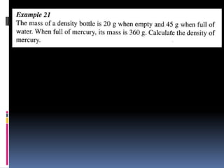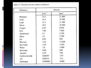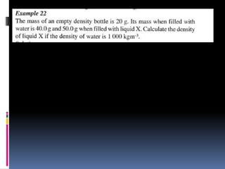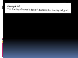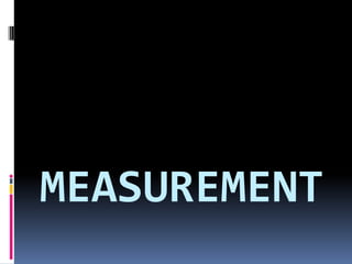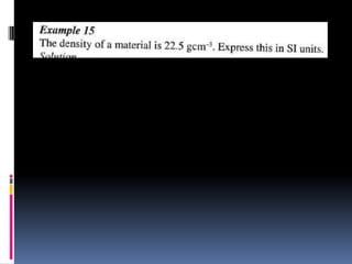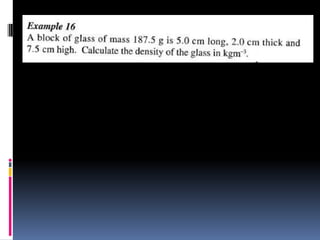 1. The document discusses various concepts related to measurement including length, area, volume, mass, density, and time. It describes the fundamental International System of Units (SI units) used to measure these physical quantities.