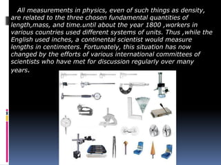 3. Mass is measured using balances, density is a ratio of mass to volume, and time intervals are recorded using stopwatches or clocks depending on the needed accuracy. Standardizing measurement systems and defining base SI units has allowed