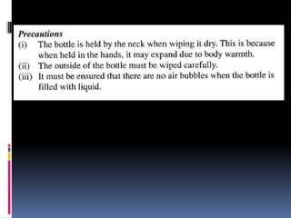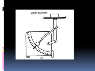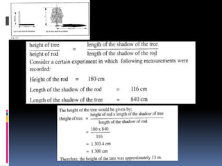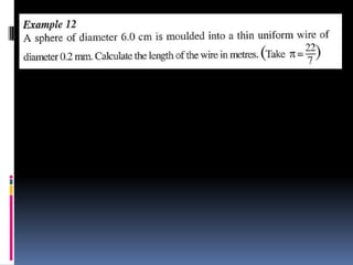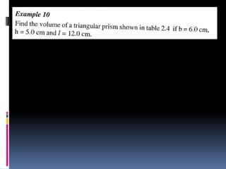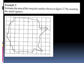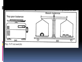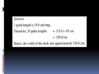 2. Methods for measuring length include using metre rules, tape measures, and estimating techniques. Area can be measured for regular shapes using formulas and irregular shapes can be divided into regular portions. Volume is measured using formulas for regular solids and displacement methods for irregular solids.
