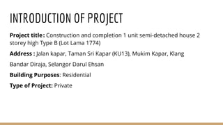 This document provides information on a proposed construction project to build a two-storey semi-detached house. It includes details like the project location, site plans, floor plans, contract forms, and bill of quantities. The project will use a PAM Contract 2006 and quantities form of contract. The bill of quantities lists items and costs for preliminaries, main building works divided into sections like piling, framing, and finishes, and provisional sums. Schedules provide specifications for finishes and daywork rates. Appendices include drawings and forms for tender bond and performance bond.