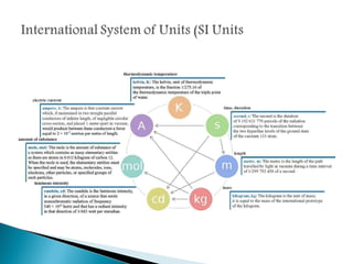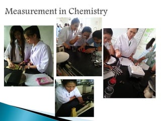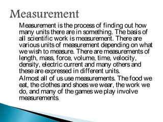 Measurement is the basis of all scientific work, as there are standardized units to quantify different properties like length, mass, time, and others. Various methods like dimensional analysis and factor-label simplify conversions between units by treating them as numbers that can be multiplied or divided. Understanding significant figures and rounding properly is also important when making measurements and calculations in science.