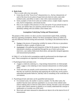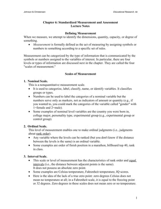 This document discusses scales of measurement and standardized testing. It covers four scales of measurement - nominal, ordinal, interval, and ratio scales - and provides examples of variables that fall under each scale. It also discusses key assumptions underlying testing and measurement, such as the idea that traits and states can be quantified, that multiple data sources should be used for important decisions, and that tests can predict non-test behaviors. The document focuses on reliability and validity as important factors for identifying good tests and assessments. It defines reliability as consistency or stability of scores and validity as the accuracy of interpretations from scores. It covers four types of reliability - test-retest, equivalent forms, internal consistency, and inter-scorer - and three types of validity evidence