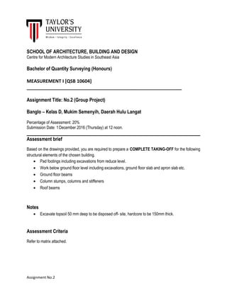 This document provides instructions for a group project assignment on quantity surveying. Students are asked to take off quantities from drawings provided for various structural elements of a building, including pad footings, excavations below ground floor, ground floor slab, beams, columns, and roof beams. The assignment aims to develop skills in measurement techniques, preparing bills of quantities, and interpreting the Standard Method of Measurement. Students must submit handwritten billing, dimension sheets, a query list, and peer assessments to their group leader, who will compile the materials into a bound document containing a summary, billing, and bill of quantities in the specified sequence. The assignment aims to help students explain, interpret, and apply measurement standards to quantity take-offs for concrete structures
