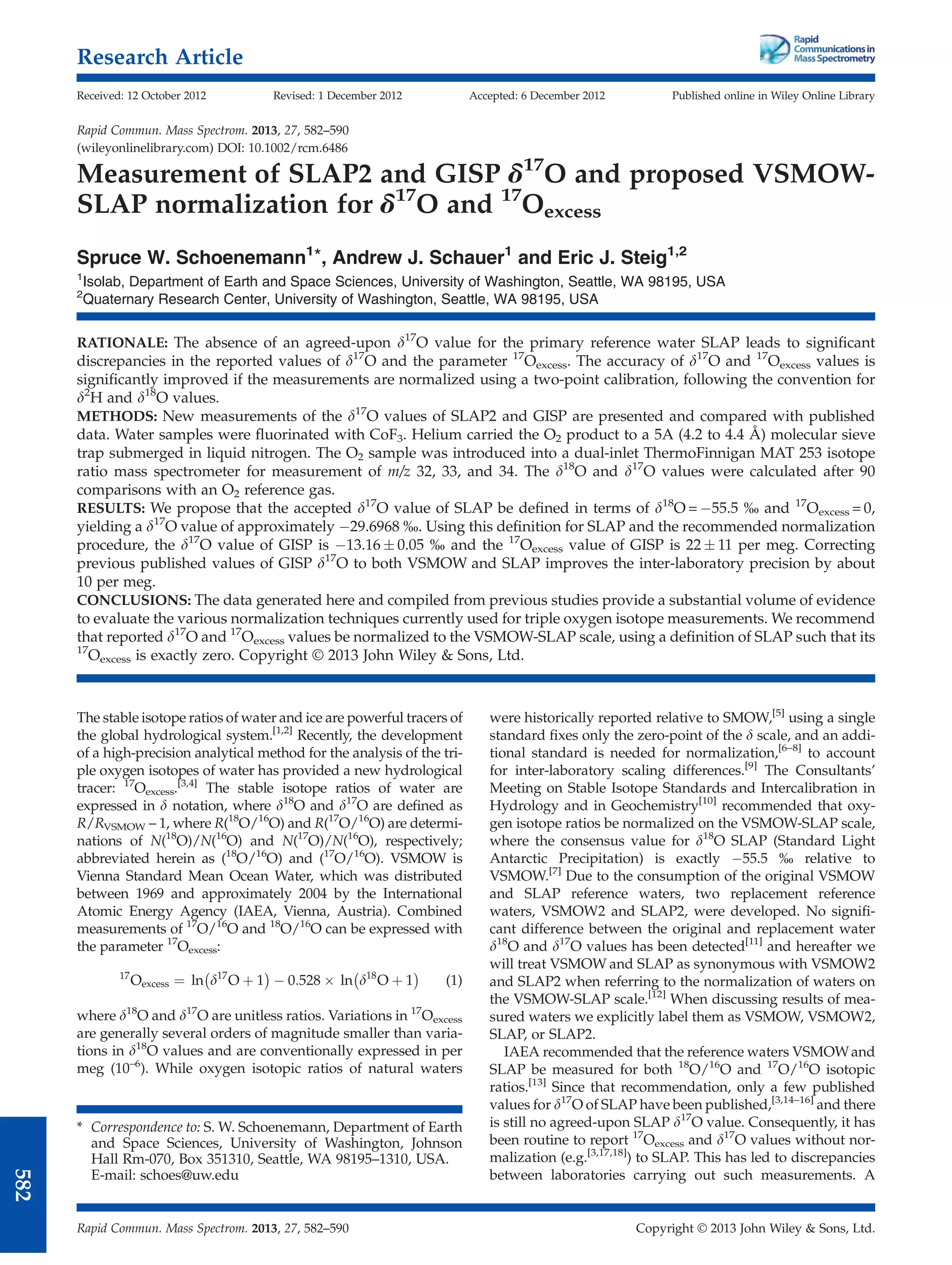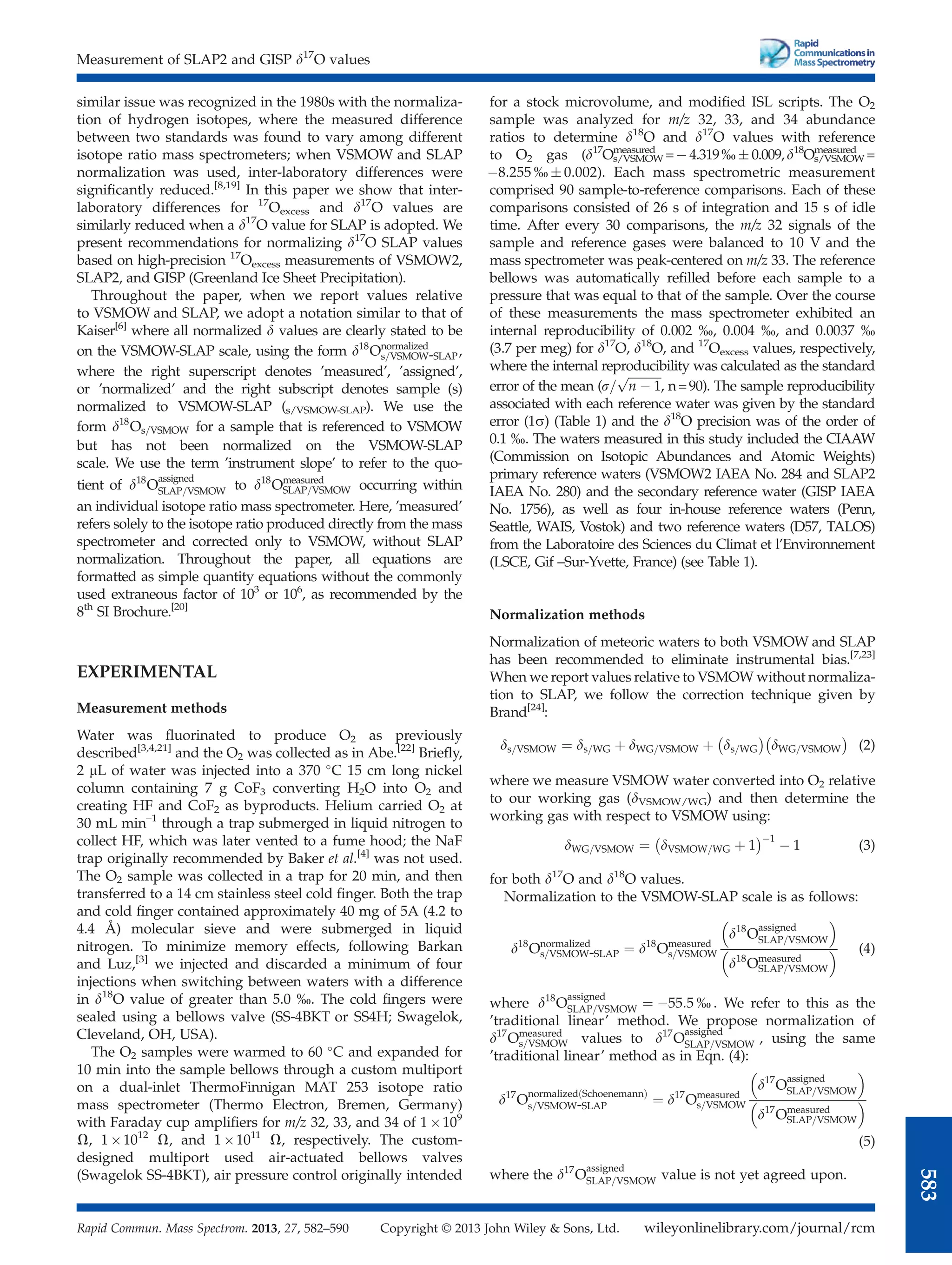 The document presents new measurements of the δ17O values of SLAP2 and GISP ice core water samples. It aims to establish a standardized δ17O value for SLAP to improve normalization and reduce discrepancies in reported δ17O and 17Oexcess values between laboratories. The authors measured the samples on a mass spectrometer and recommend defining SLAP to have δ18O = -55.5‰ and 17Oexcess = 0, yielding an approximate δ17O value of -29.6968‰. Using this normalization, their measured values of GISP were δ17O = -13.16 ± 0.05‰ and 17Oexcess = 22 ± 11 per meg. They conclude