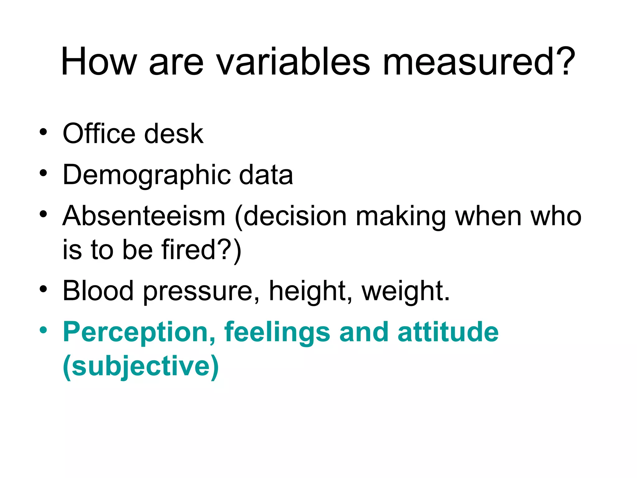 This document discusses different ways to measure variables and concepts. It describes nominal, ordinal, interval, and ratio scales of measurement. It also discusses operational definitions and provides examples of how to operationalize abstract concepts. Finally, it outlines various rating scales that can be used to measure perceptions, attitudes, and preferences including Likert scales, semantic differentials, ranking scales, and paired comparisons.