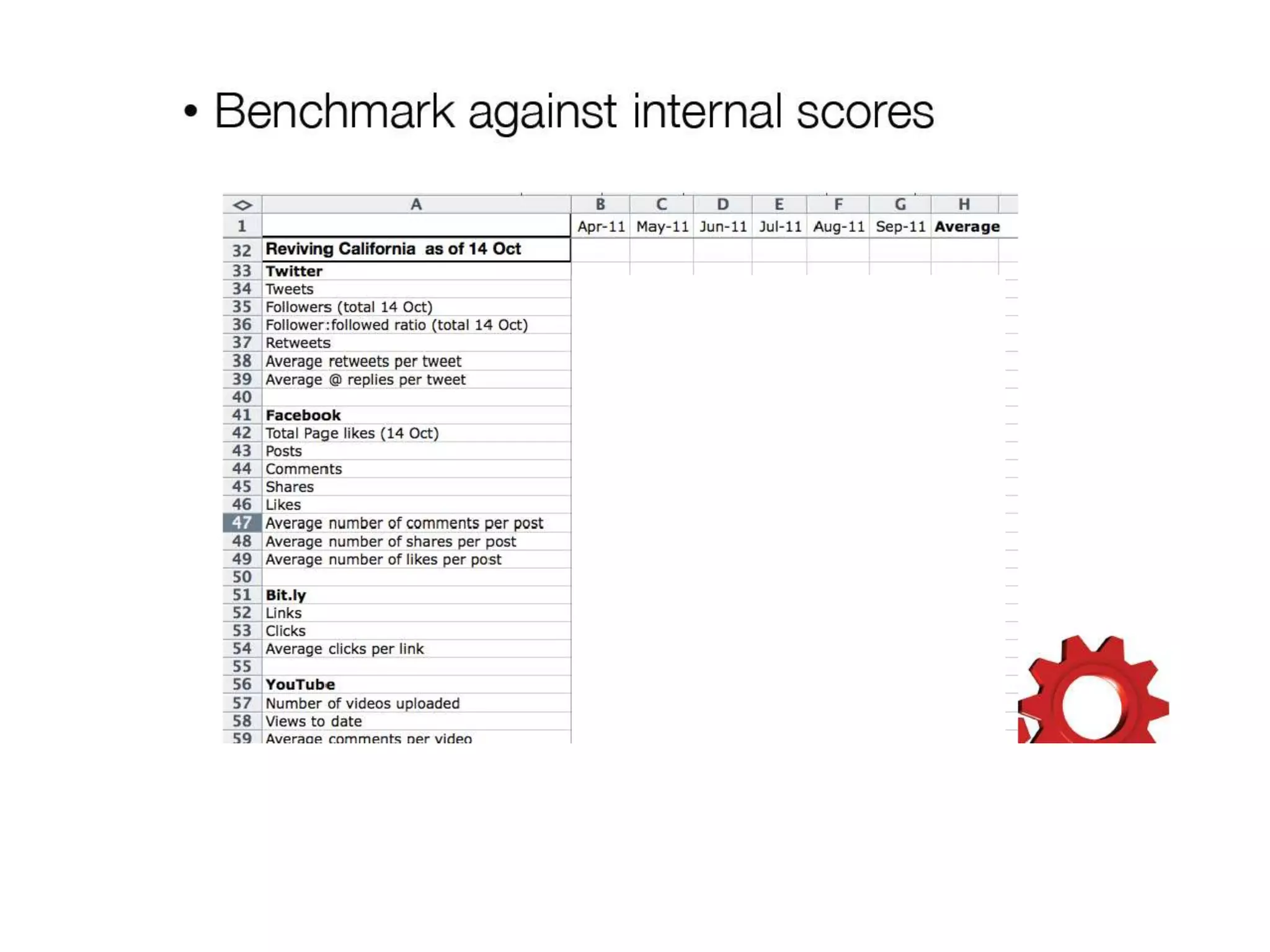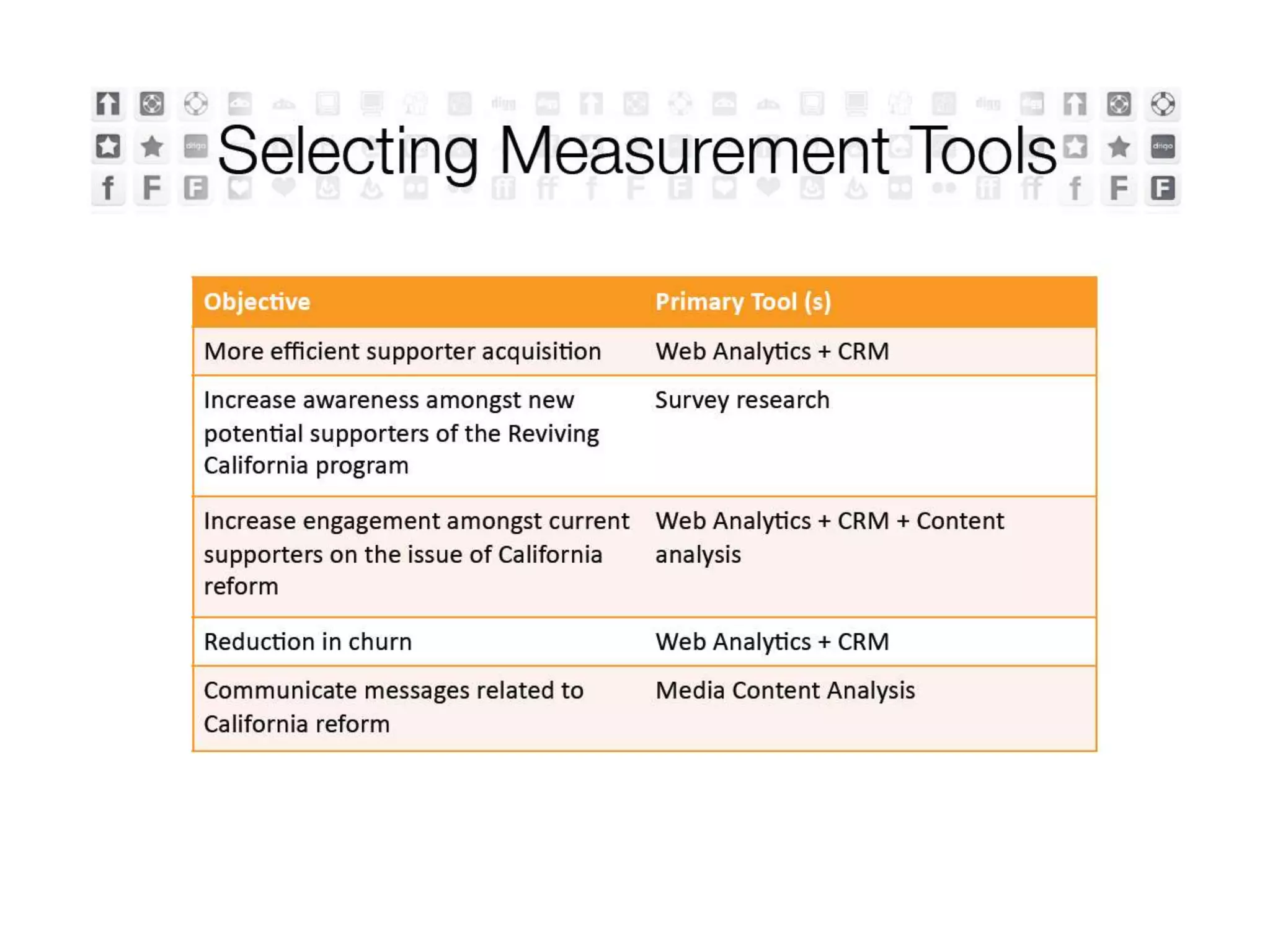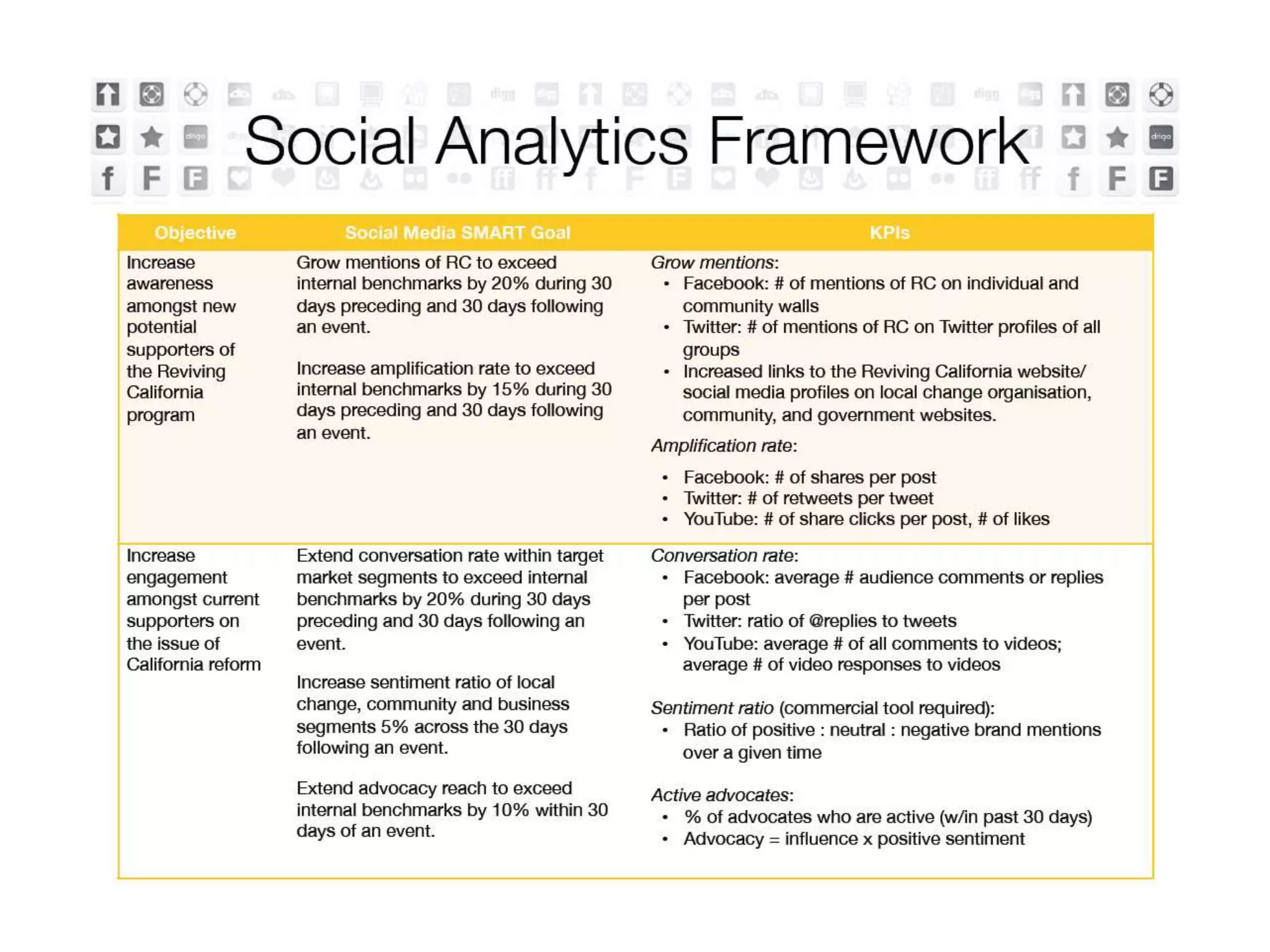 The document summarizes a session on benchmarking and key performance indicators (KPIs) for measuring social media efforts at nonprofits. Three organizations - the American Leadership Forum Silicon Valley, the National Wildlife Federation, and the Monterey Bay Aquarium - shared their experiences developing SMART objectives, identifying relevant peer organizations for benchmarking, and establishing KPIs to track performance. The session provided an overview of benchmarking and KPIs, and highlighted examples and challenges the organizations have faced in designing and implementing social media measurement pilots.