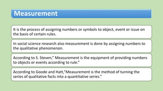 The document discusses various concepts related to measurement, scaling, and sampling in social science research. It defines measurement as assigning numbers or symbols to objects, events, or issues according to certain rules. Scaling is preparing a continuum to measure abstract concepts quantitatively. Common scales discussed include the Likert scale, Thurstone scale, and Guttman scale. The document also discusses the importance of validity and reliability in measurement. Finally, it covers various probability and non-probability sampling techniques used in research like simple random sampling, stratified sampling, and convenience sampling.