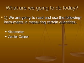 The document discusses how to use a micrometer and vernier caliper to accurately measure objects. It explains that a micrometer can measure to the thousandths of a millimeter, while a vernier caliper uses both a main scale and vernier scale to determine measurements to the hundredths of a centimeter. Examples are provided of taking measurements with both tools and calculating the readings based on where the scales align. The document concludes by having the reader take measurements of some everyday objects using the micrometer and vernier caliper.