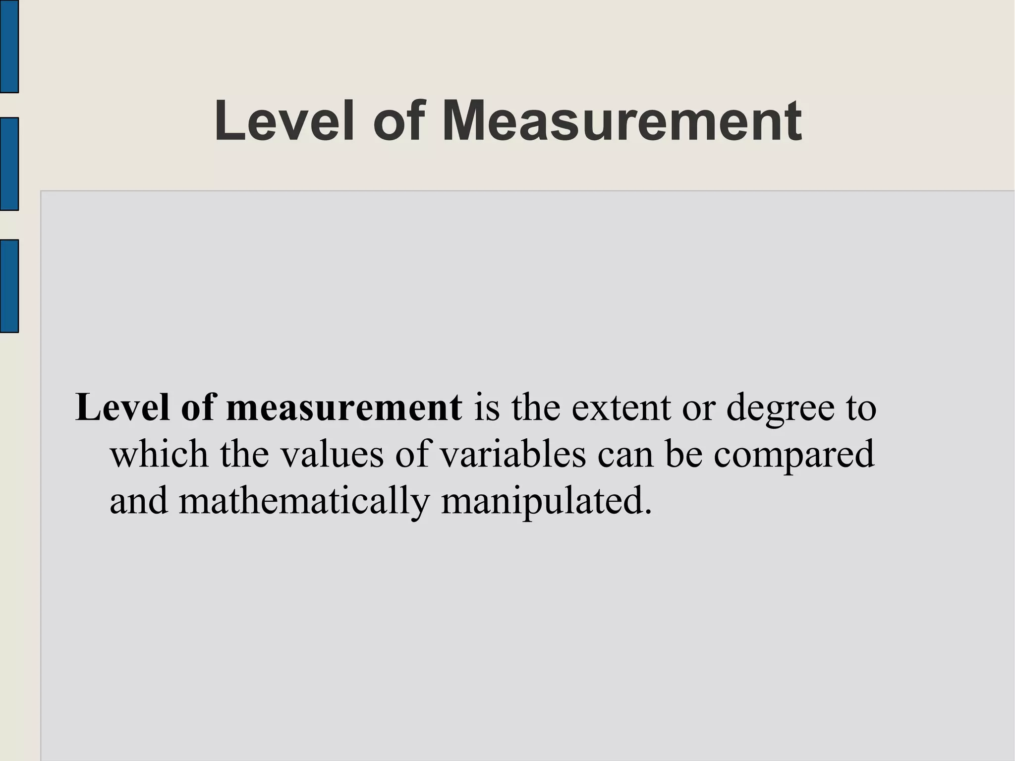 Level of measurement refers to the degree to which variables can be compared and mathematically manipulated. There are four levels of measurement: nominal, ordinal, interval, and ratio. Nominal measurement involves categorizing variables without mathematical relationships between categories. Ordinal measurement allows ranking but not precise measurement of distances between ranks. Interval measurement assigns real numbers with equal units of measurement and mathematical properties. Ratio measurement has all interval properties plus an absolute zero point.