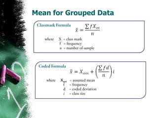 This document discusses measures of central tendency - mean, median, and mode - for grouped data. It provides examples of calculating the mean, median, and mode using frequency distributions with class intervals and frequencies. The mean is calculated using the class midpoint formula or coded formula. The median is found by determining the median class based on the cumulative frequency. The mode is the class with the highest frequency.