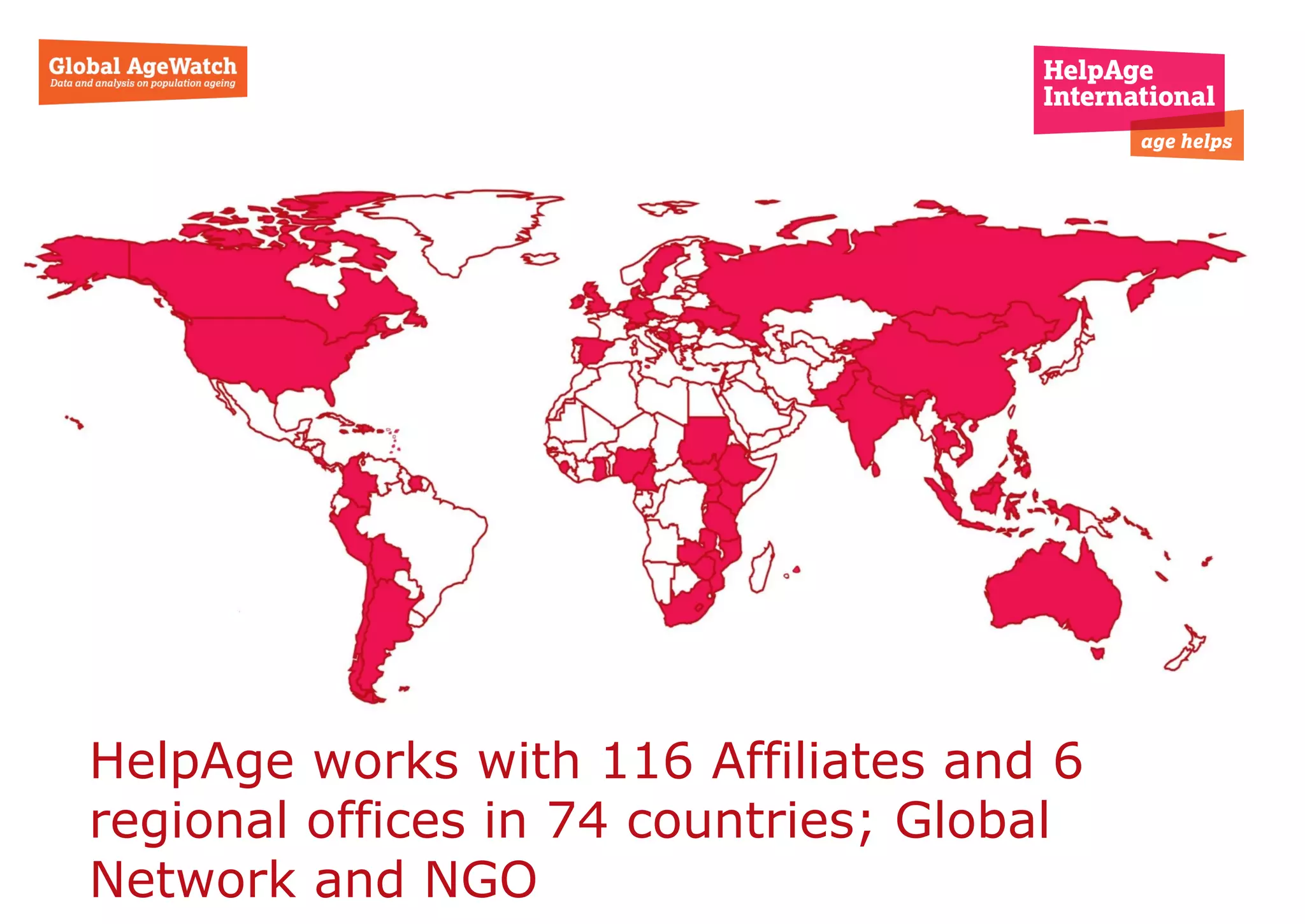 1) HelpAge International works with affiliates and regional offices in 74 countries to advocate for older people globally.