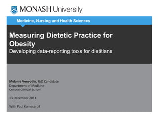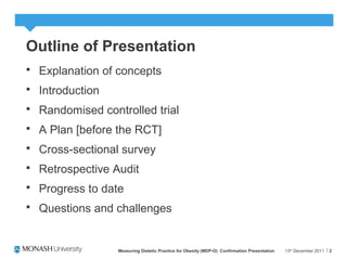 The document outlines a presentation on measuring dietetic practice for obesity, aiming to develop a data-recording and reporting system for dietitians to enhance their effectiveness in managing obesity. The study includes a randomized controlled trial to test the hypothesis that dietitians who record and analyze data can achieve better client weight loss outcomes compared to those who do not. Additionally, it discusses various data collection methods such as surveys and audits to investigate current practices among dietitians in Australia.