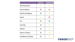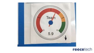 The document discusses measuring team effectiveness through metrics. It provides examples of good and bad metrics, focusing on metrics that measure building the right thing, building the thing right, and building the thing in a sustainable way. Good metrics are developed by the team to improve performance and focus on important areas for improvement. The document also discusses measuring cycle time, engagement, production incidents, and other metrics to understand progress, eliminate waste, and ensure team health and quality.
