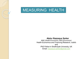 This document discusses different ways of measuring health, including natural measurements like healthy days and quality-adjusted life years (QALYs) and disability-adjusted life years (DALYs). It describes how QALYs quantify both the quality and quantity of life by assigning weights between 0 and 1 to different health states. Methods for estimating these weights include rating scales, time trade-off, and standard gambling. The document also discusses instruments like the EQ-5D that are used to measure health-related quality of life and provide weights to calculate QALYs and QALY gains from interventions.