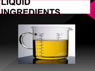 The document outlines a series of steps and ingredients for measuring and preparing baking ingredients accurately. It emphasizes the importance of using the correct tools and procedures for both dry and liquid ingredients. Additionally, it suggests interviewing a baker to understand the challenges faced in bread and pastry production.