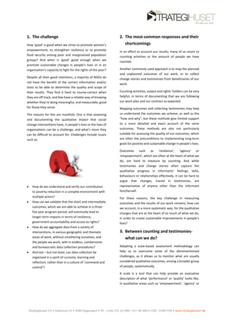 This document introduces scales to measure qualitative results of development work. Scales allow assessment of outcomes like empowerment, resilience, and institutional capacity. They describe performance levels along a ladder or phases. Developing scales participatorily helps ensure stakeholder values are considered. Scales can systematically monitor qualitative changes among groups and aggregate diverse data better than counting activities or collecting testimonies alone. They provide a fuller picture of situations than single indicators.