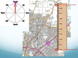 Scale is used on maps to shrink the real world so that it fits on the page. Scale represents how much the mapmaker has reduced the actual distances and sizes. The document teaches how to use different map scales by relating centimeter measurements on the map to equivalent kilometer distances in real life. It also introduces a "magic strip" technique to measure curved or irregular distances on a map using a flexible strip instead of a standard ruler.