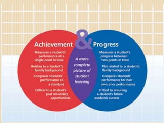 This document introduces value added assessment as a method for measuring student academic growth and progress over time rather than just achievement at a single point. It discusses two 11th grade students, Anne who scores high on standardized tests but shows less growth, while David scores low but demonstrates significant academic growth each year. Value added assessment compares individual student performance over time to determine how much progress each student makes regardless of achievement level. The document outlines benefits of value added data for educators to evaluate their impact on student learning and better support all students.