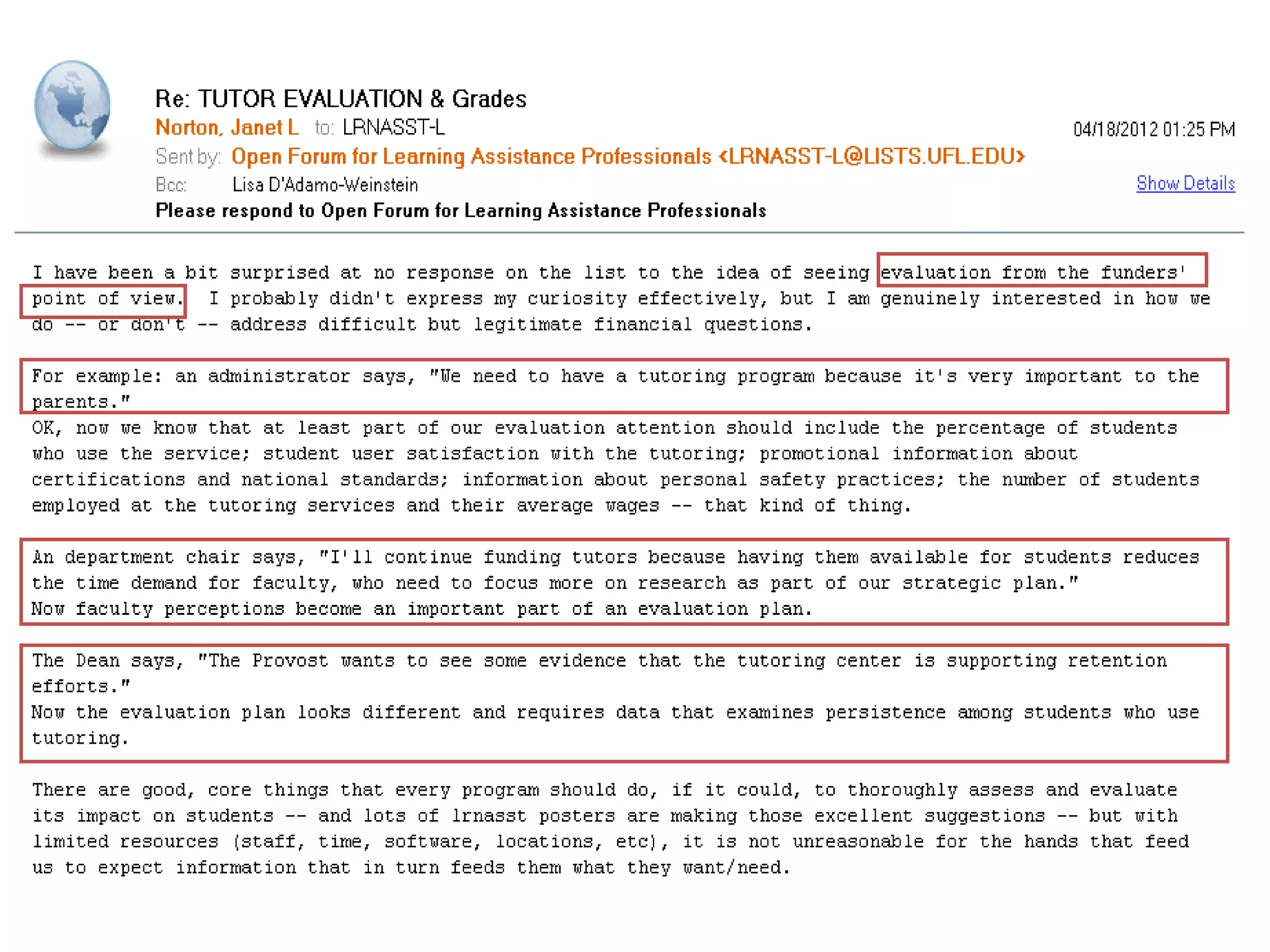 The document outlines a webinar and workshop series focused on assessing student success, particularly in tutoring and learning centers. It emphasizes the importance of continuous assessment processes that align educational goals with student learning outcomes, discussing methods for developing effective assessment plans. Various quantitative and qualitative assessment modes are presented, alongside the significance of alignment with institutional missions and stakeholder involvement for meaningful improvement in educational programs.