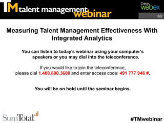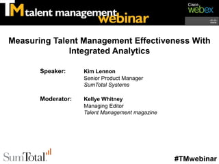 The document provides an overview of a webinar focused on measuring talent management effectiveness using integrated analytics, featuring speaker Kim Lennon and moderator Kellye Whitney. It covers key challenges HR faces, the significance of talent analytics in business performance, and various levels of HR maturity from compliance-driven to business-integrated HR. Additionally, it discusses the need for integrated talent management systems and the role of key performance indicators (KPIs) in measuring organizational success.
