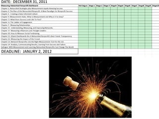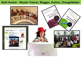 Beth Kanter gave a presentation on using data and networks to drive social change. She discussed how nonprofits can progress from just crawling in their use of social media and networks to walking, running, and flying by becoming more data-informed. Kanter presented models for measuring social media return on investment and becoming a networked nonprofit at different maturity levels. She emphasized starting small with data collection, defining goals and key performance indicators, and using measurement to continually learn and improve strategies for social change.
