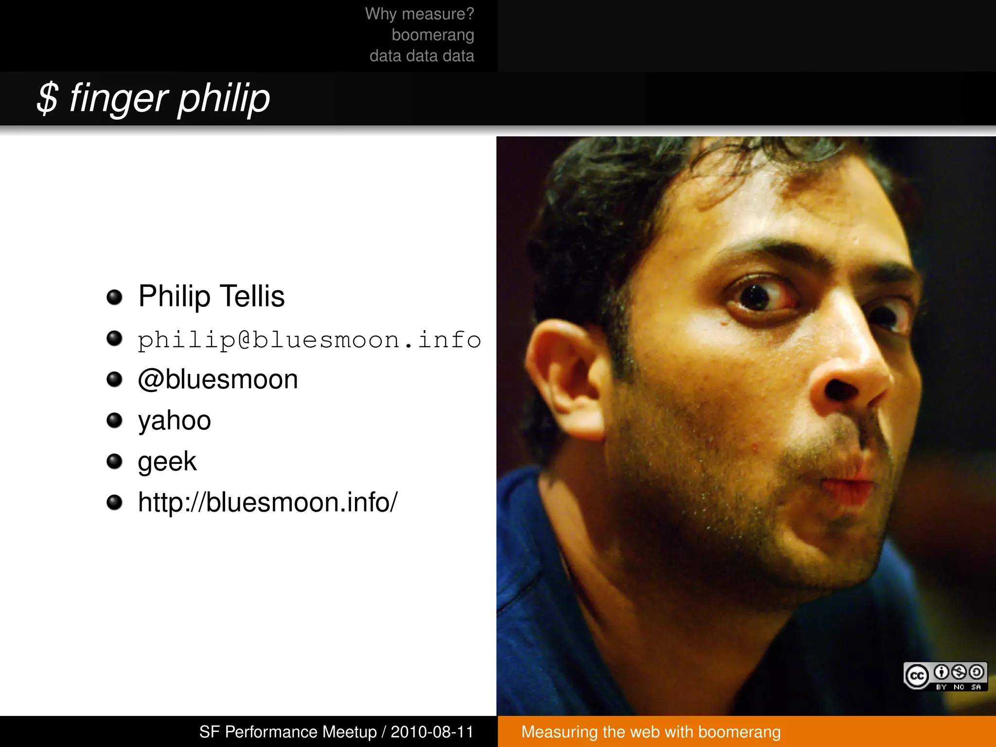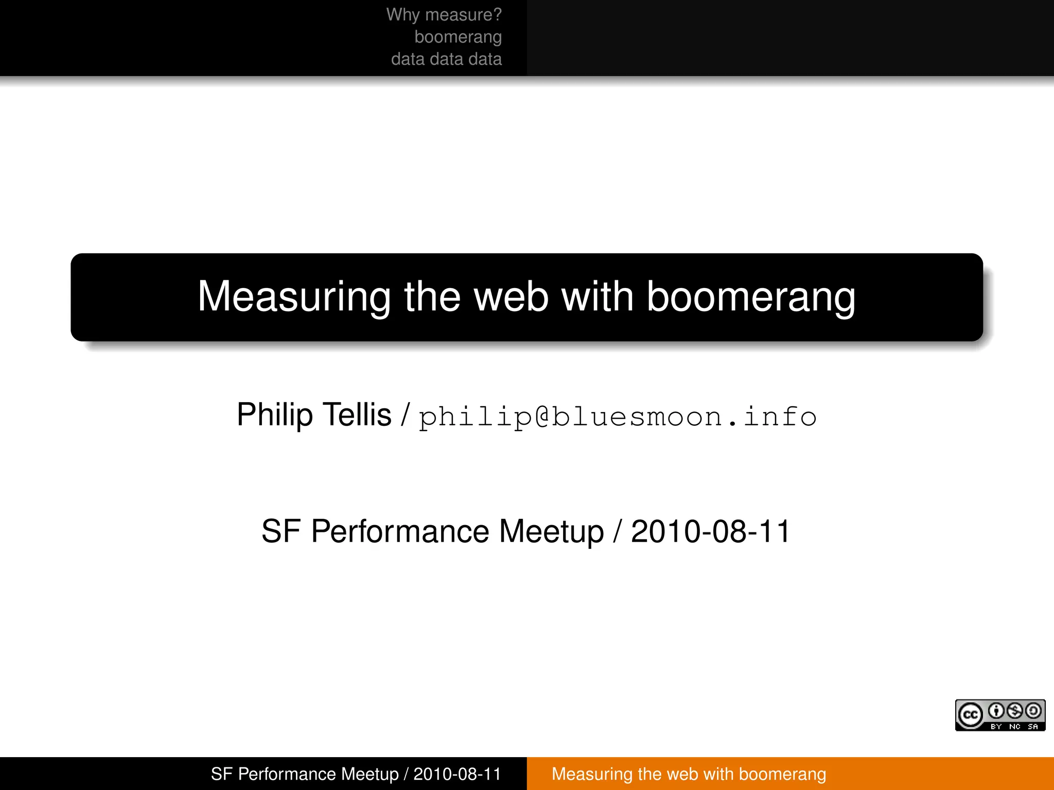 The document discusses measuring web performance from the end user's perspective using JavaScript. It notes that most web slowness comes from the front-end, which developers can't control due to browser, plugin, OS and other variations. To get accurate measurements, performance must be measured directly from the user's device using JavaScript, which is ubiquitous. The talk will discuss Boomerang, a JavaScript tool that measures page load performance and sends anonymized data back to developers for analysis.