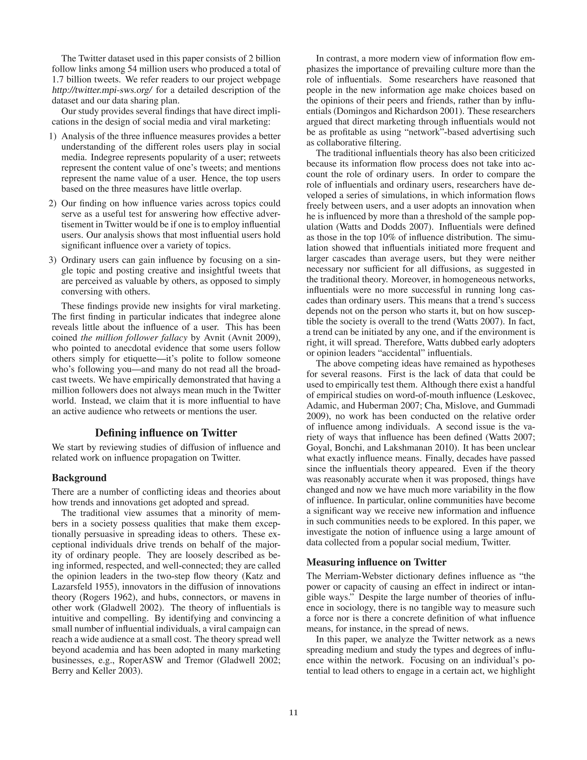 This document presents an empirical analysis of user influence on Twitter, evaluating three measures: indegree, retweets, and mentions. It challenges traditional theories of influence, suggesting that popular users do not always correlate with actual influence, and highlights that influence can vary across different topics and is often achieved through targeted efforts. The study underscores the importance of understanding user dynamics and the social context of Twitter to optimize marketing strategies.