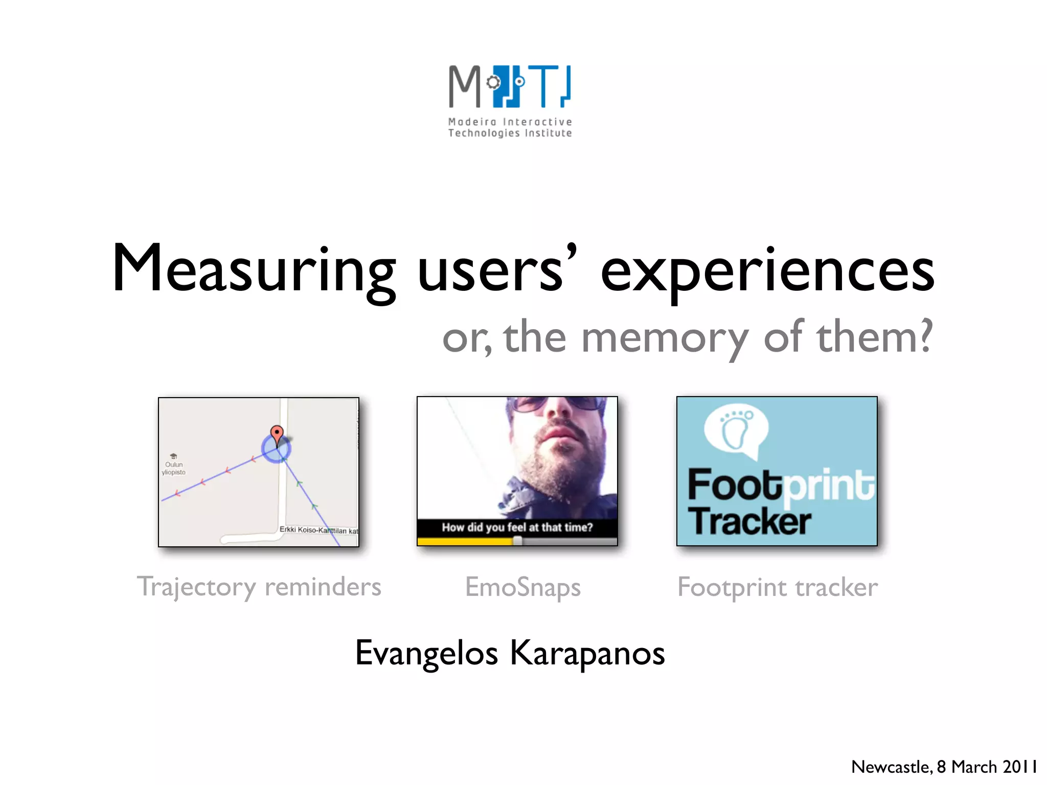 This document discusses several studies related to measuring and reconstructing user experiences over time. It first describes research on how users form overall evaluations of interactive products over time. It then examines whether an online survey tool called iScale can help users recollect their experiences with a product by assisting in the reconstruction of memories. Finally, it explores whether mobile sensors and technology can help participants reconstruct their daily experiences and locations through tools like trajectory reminders, photos of emotional expressions, and a footprint tracker using visual, location and context cues.