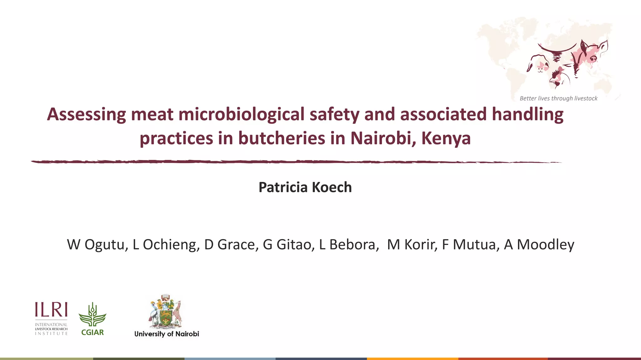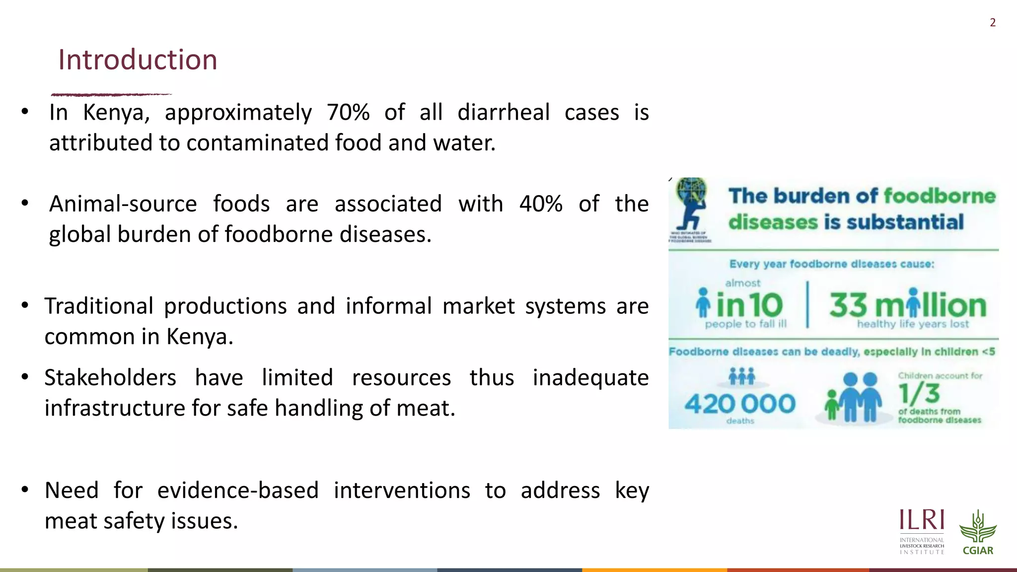 The document assesses microbiological safety and handling practices of meat in butcheries in Nairobi, Kenya, highlighting that approximately 70% of diarrhea cases in the country are linked to contaminated food. The study found high levels of coliform contamination in meat samples and noted several poor hygiene practices among butchers, posing risks for foodborne illnesses. Recommendations include educating butcher shop attendants on safe meat handling and enhancing food safety interventions based on the findings.