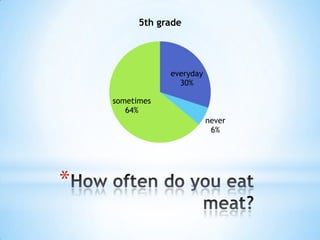 The document presents survey results from 5th, 6th, and 7th grade students regarding their habits and preferences. Responses indicate varying percentages for activities such as frequency of specific behaviors and preferences for types of meat. Overall, the data distinguishes between groups like boys and girls and highlights differences in their answers.
