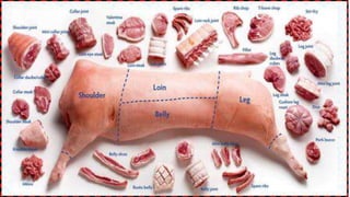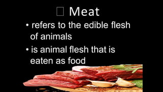 Meat refers to the edible flesh of animals that is eaten as food. It provides nutrients like protein, iron, and B vitamins. Meat consists mainly of water, protein, and fat. Various knives, cutting boards, and thermometers are used to process meat. Common market forms include fresh, chilled, cured, frozen, canned, and dried meats. Meats come from animals like pigs, cattle, sheep, carabao, deer, and goats. Cooking meat is important for tenderness, palatability, and safety by destroying microorganisms.