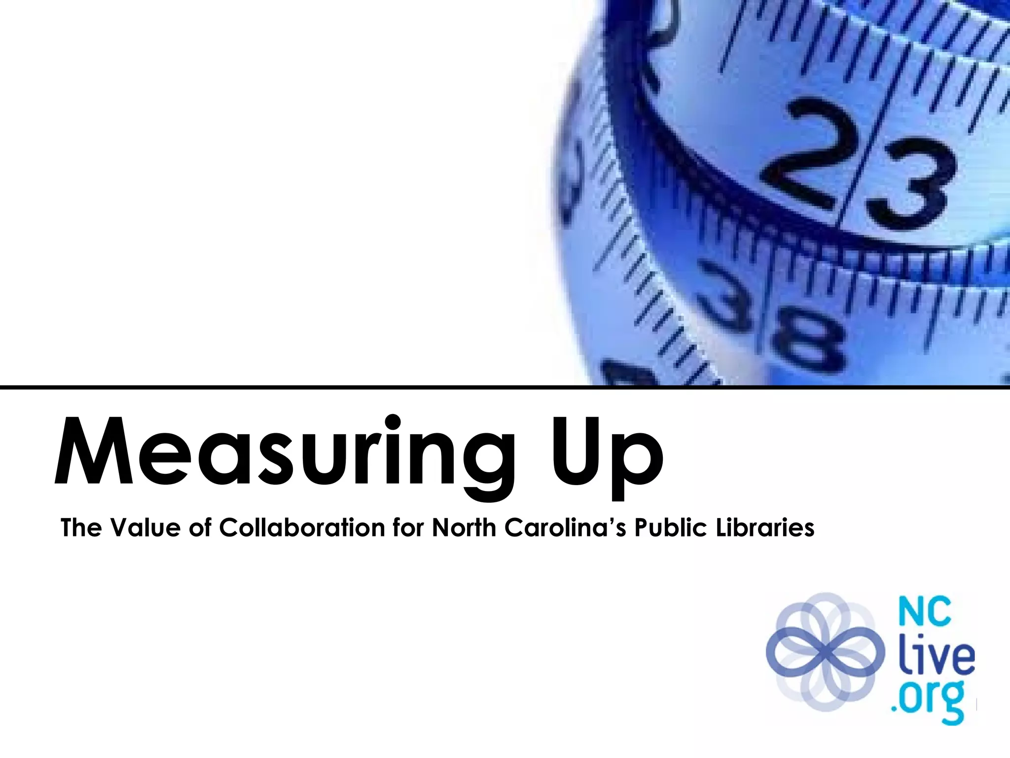 The document discusses measuring the value of resources provided by NC LIVE, a consortium that provides online resources to North Carolina public libraries. It describes NC LIVE's efforts to calculate return on investment by determining the fair market value of resources, but issues with this approach are identified. The document then outlines a capstone project conducted by a graduate student to survey NC LIVE users and determine the value of eBooks, audiobooks, and videos to public library patrons based on their willingness to pay and other factors.