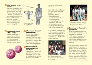 Cancer of the cervix is caused by HPV infection, which is usually transmitted through sex. It occurs when cells on the cervix become abnormal and grow uncontrollably. Girls and women who are sexually active are most at risk. Early signs may include bleeding after sex or between periods. However, HPV infection often does not show signs for 10-15 years. Vaccination against HPV is available for girls aged 10 and can help prevent cervical cancer later in life.
