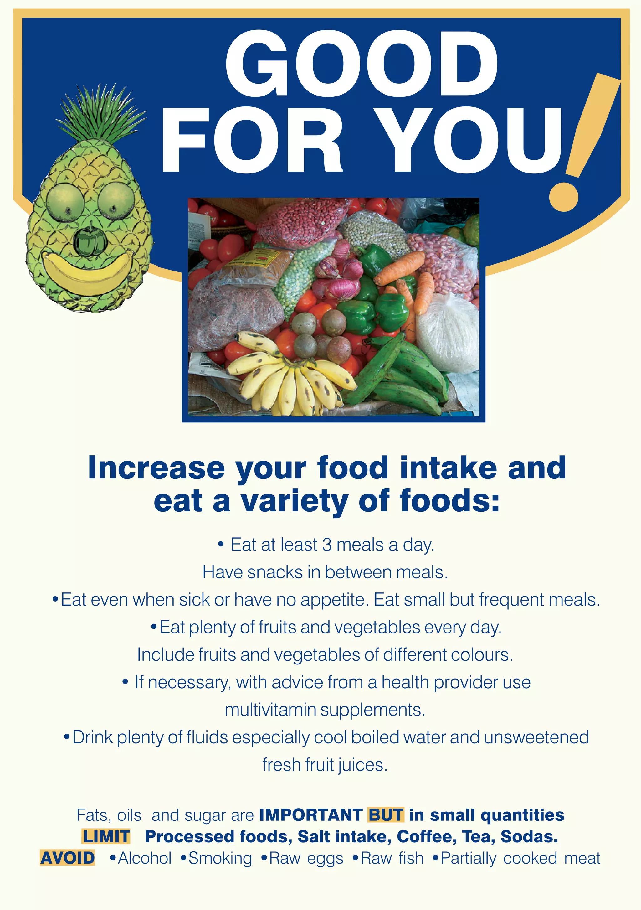 Eat a variety of foods including fruits and vegetables of different colors at least 3 meals a day plus snacks. Drink plenty of fluids like water and unsweetened fruit juice. While fats, oils, and sugar are important, consume them in small amounts and limit processed foods, salt, coffee, tea, sodas, alcohol, smoking, raw eggs, raw fish, and partially cooked meat.